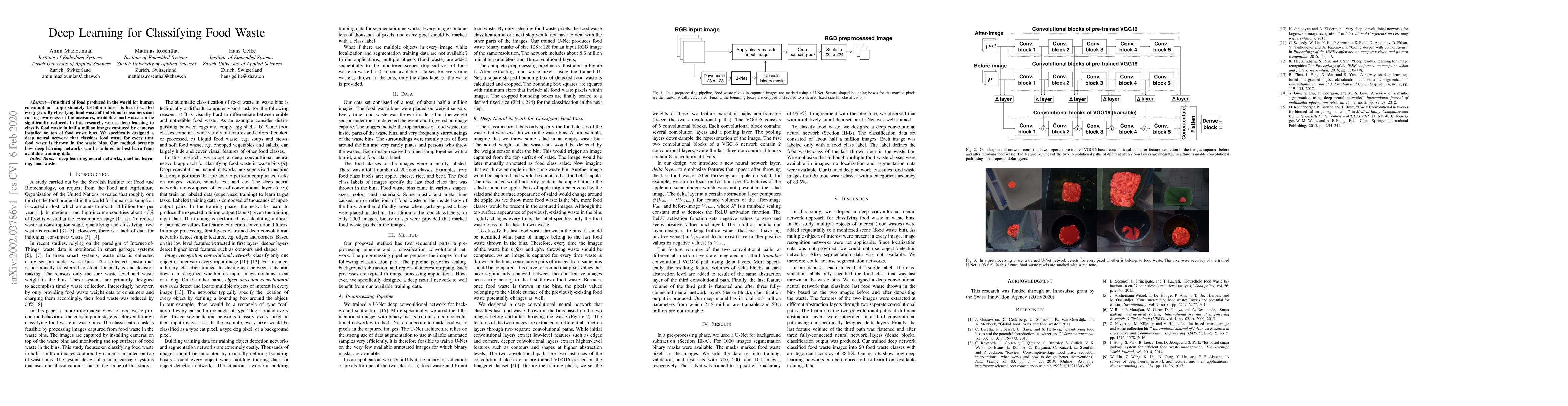 This research employs deep learning to classify food waste from half a million images captured by cameras on waste bins, aiming to reduce avoidable food waste by identifying and raising awareness of consumer waste. The study designs a tailored deep neural network to optimize learning from available training data.