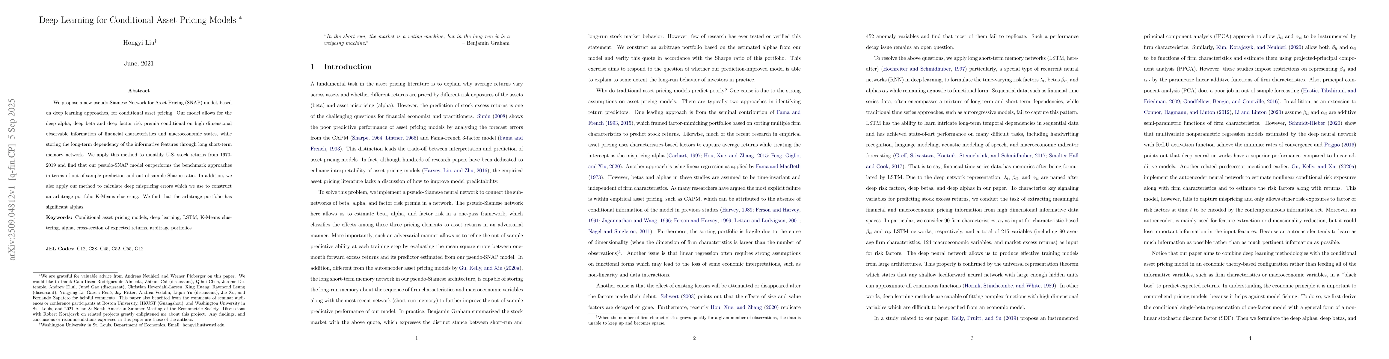 We propose a new pseudo-Siamese Network for Asset Pricing (SNAP) model, based on deep learning approaches, for conditional asset pricing. Our model allows for the deep alpha, deep beta and deep factor risk premia conditional on high dimensional observable information of financial characteristics and macroeconomic states, while storing the long-term dependency of the informative features through long short-term memory network. We apply this method to monthly U.S. stock returns from 1970-2019 and find that our pseudo-SNAP model outperforms the benchmark approaches in terms of out-of-sample prediction and out-of-sample Sharpe ratio. In addition, we also apply our method to calculate deep mispricing errors which we use to construct an arbitrage portfolio K-Means clustering. We find that the arbitrage portfolio has significant alphas.
