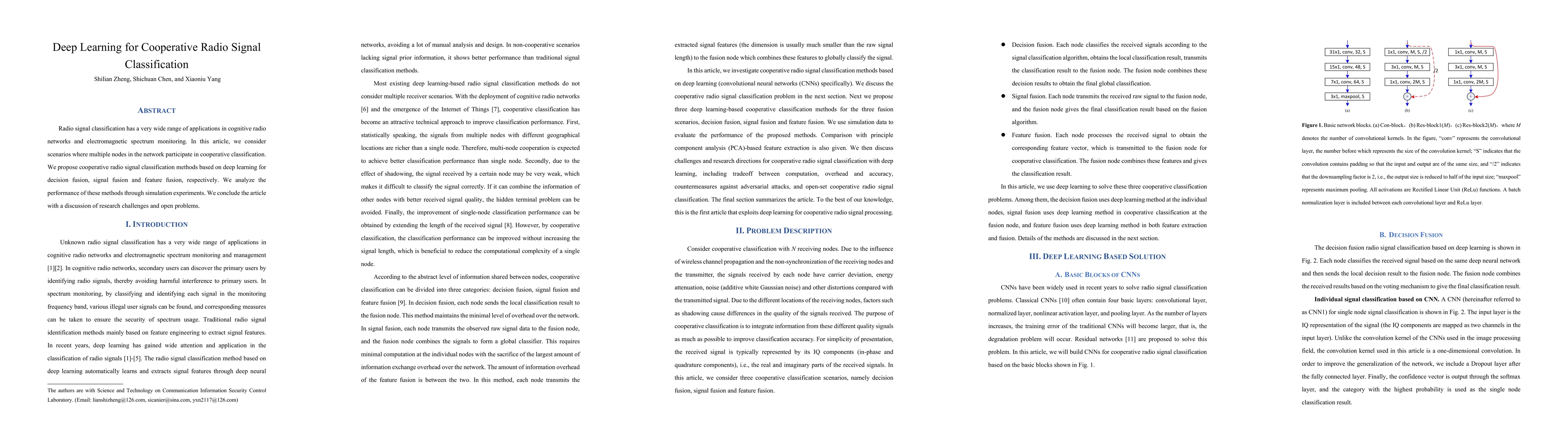 This paper proposes deep learning methods for cooperative radio signal classification in cognitive radio networks, focusing on decision, signal, and feature fusion. Simulation results evaluate performance, while the paper also discusses ongoing research challenges and open problems.