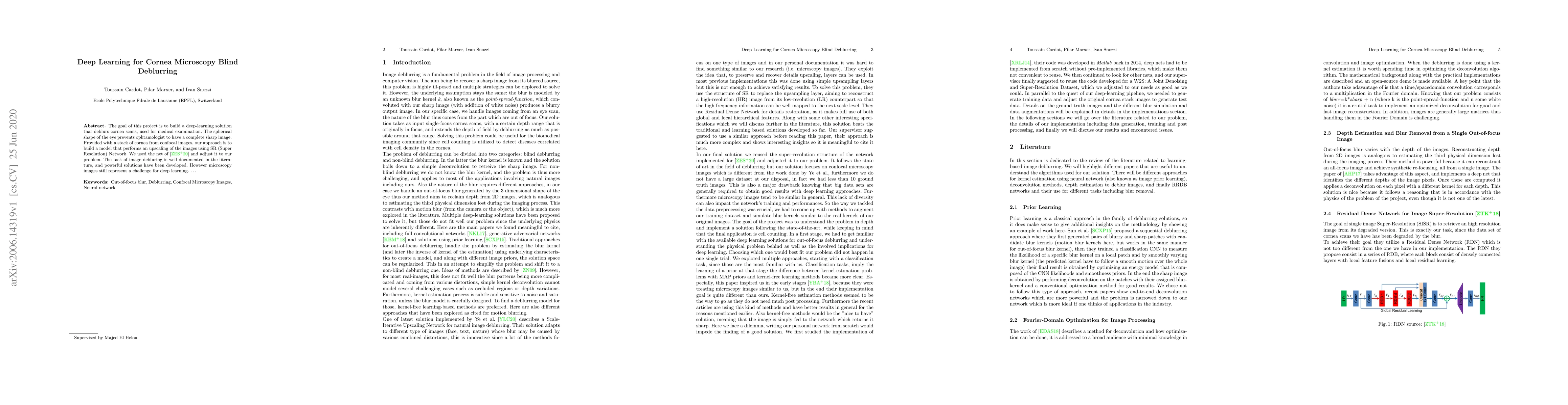 The goal of this project is to build a deep-learning solution that deblurs cornea scans, used for medical examination. The spherical shape of the eye prevents ophtamologist from having completely sharp image. Provided with a stack of corneas from confocal images, our approach is to build a model that performs an upscaling of the images using an SR (Super Resolution) Network.