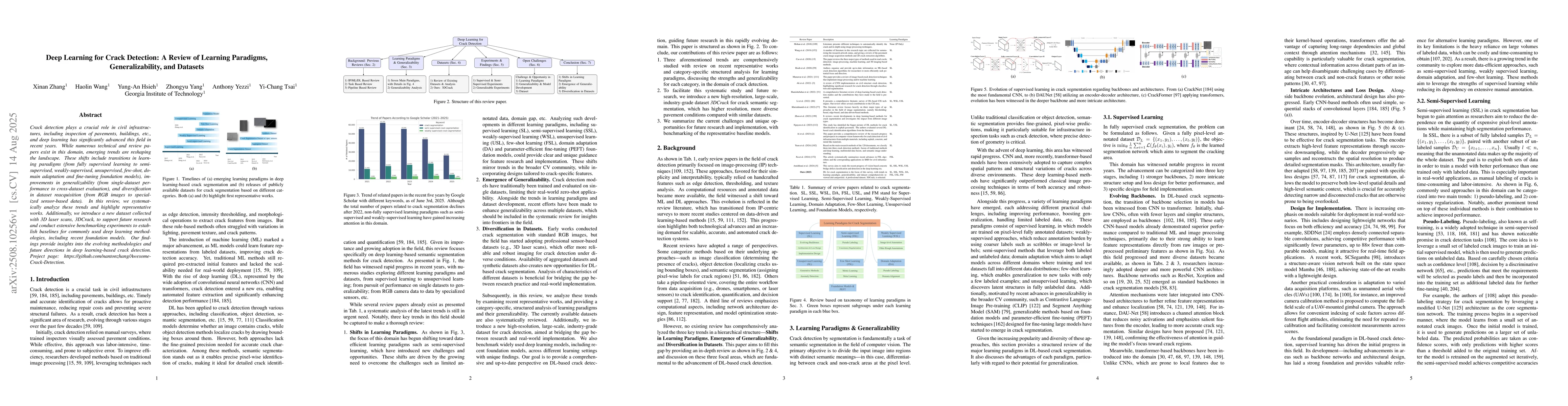 Crack detection plays a crucial role in civil infrastructures, including inspection of pavements, buildings, etc., and deep learning has significantly advanced this field in recent years. While numerous technical and review papers exist in this domain, emerging trends are reshaping the landscape. These shifts include transitions in learning paradigms (from fully supervised learning to semi-supervised, weakly-supervised, unsupervised, few-shot, domain adaptation and fine-tuning foundation models), improvements in generalizability (from single-dataset performance to cross-dataset evaluation), and diversification in dataset reacquisition (from RGB images to specialized sensor-based data). In this review, we systematically analyze these trends and highlight representative works. Additionally, we introduce a new dataset collected with 3D laser scans, 3DCrack, to support future research and conduct extensive benchmarking experiments to establish baselines for commonly used deep learning methodologies, including recent foundation models. Our findings provide insights into the evolving methodologies and future directions in deep learning-based crack detection. Project page: https://github.com/nantonzhang/Awesome-Crack-Detection