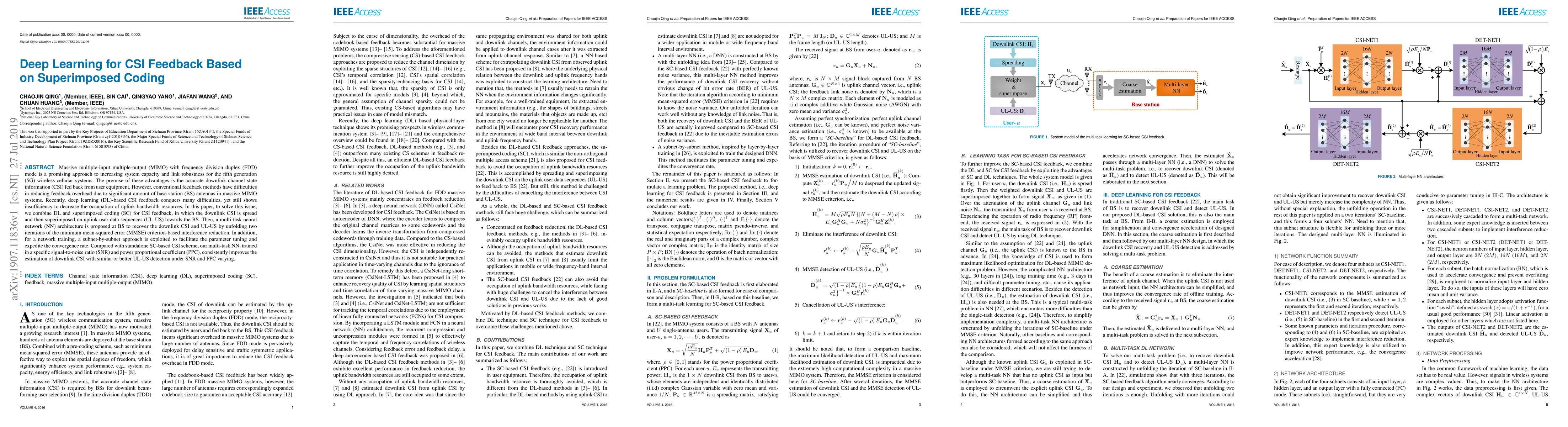 Massive multiple-input multiple-output (MIMO) with frequency division duplex (FDD) mode is a promising approach to increasing system capacity and link robustness for the fifth generation (5G) wireless cellular systems. The premise of these advantages is the accurate downlink channel state information (CSI) fed back from user equipment. However, conventional feedback methods have difficulties in reducing feedback overhead due to significant amount of base station (BS) antennas in massive MIMO systems. Recently, deep learning (DL)-based CSI feedback conquers many difficulties, yet still shows insufficiency to decrease the occupation of uplink bandwidth resources. In this paper, to solve this issue, we combine DL and superimposed coding (SC) for CSI feedback, in which the downlink CSI is spread and then superimposed on uplink user data sequences (UL-US) toward the BS. Then, a multi-task neural network (NN) architecture is proposed at BS to recover the downlink CSI and UL-US by unfolding two iterations of the minimum mean-squared error (MMSE) criterion-based interference reduction. In addition, for a network training, a subnet-by-subnet approach is exploited to facilitate the parameter tuning and expedite the convergence rate. Compared with standalone SC-based CSI scheme, our multi-task NN, trained in a specific signal-to-noise ratio (SNR) and power proportional coefficient (PPC), consistently improves the estimation of downlink CSI with similar or better UL-US detection under SNR and PPC varying.