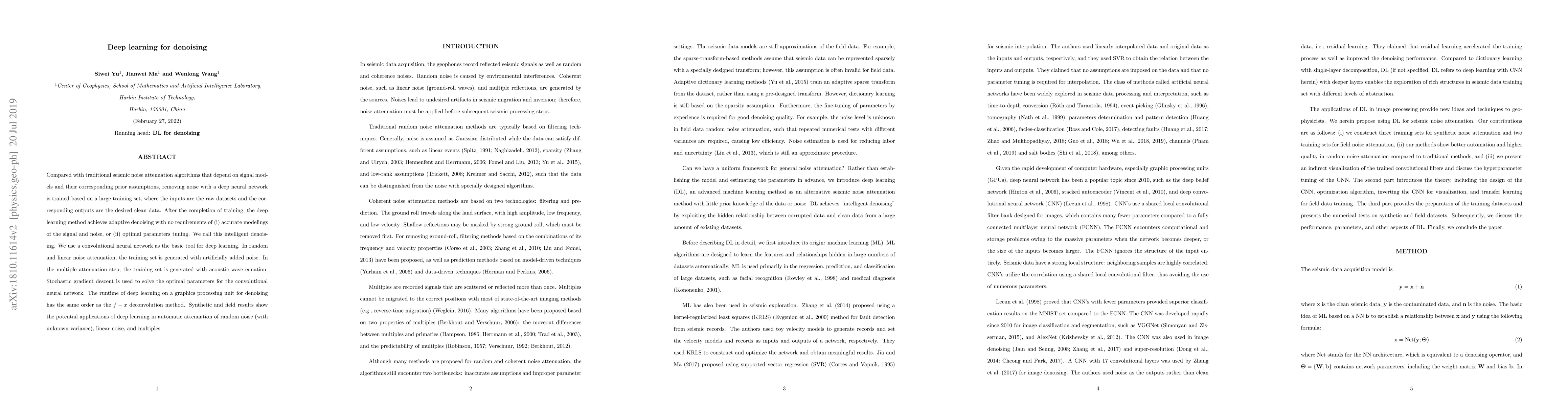 A new method using deep learning to remove noise from seismic data achieves adaptive denoising without requiring signal models or optimal parameters tuning, offering potential applications in automatic noise attenuation.