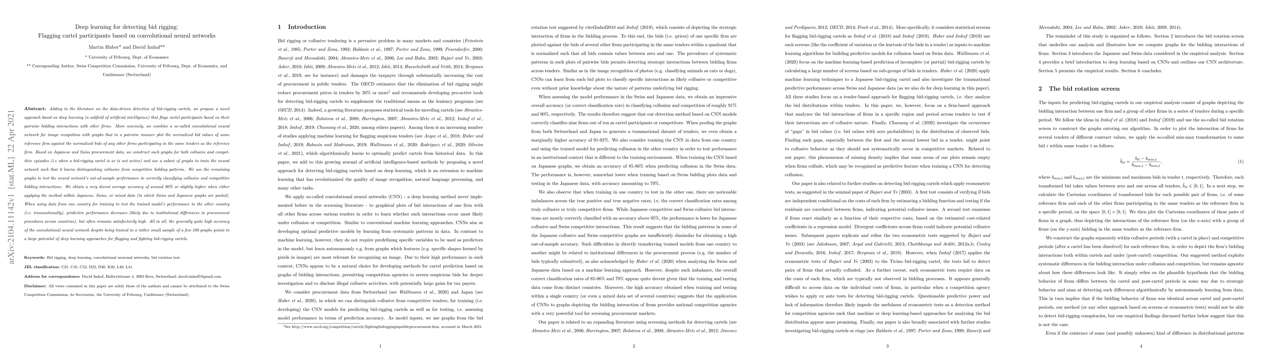 This paper proposes a deep learning method using convolutional neural networks to detect bid rigging by analyzing bidding interactions. The approach constructs graphs from procurement data and trains a neural network to distinguish collusive from competitive bidding patterns, achieving an average accuracy of around 90% in classifying bid-rigging cartels.