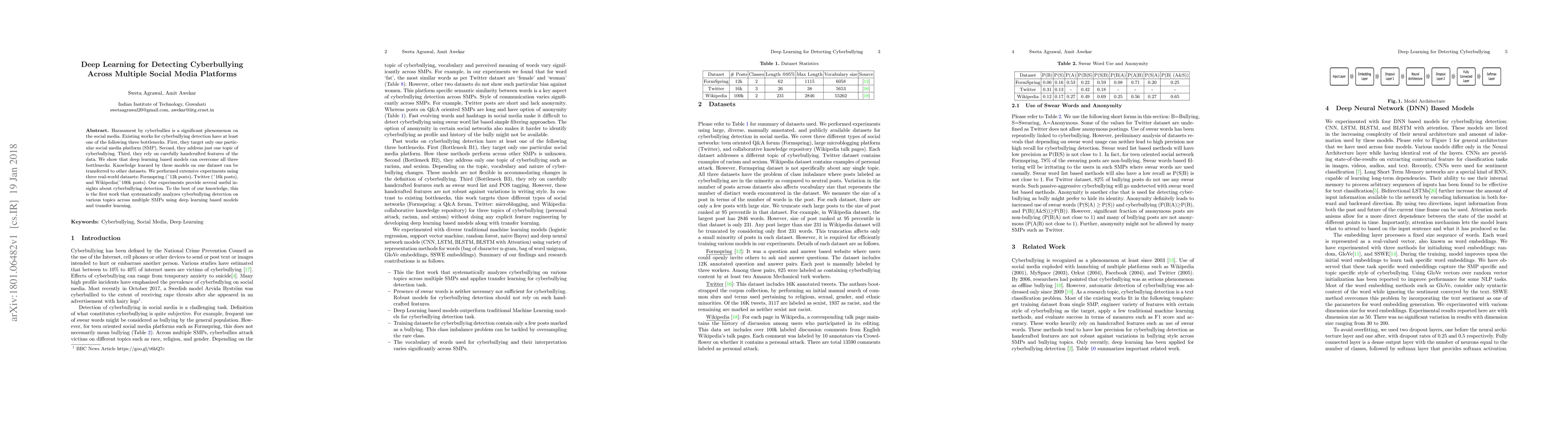 This paper proposes deep learning models to detect cyberbullying across multiple social media platforms, overcoming limitations of previous methods that focus on single platforms or topics. The study demonstrates transfer learning capabilities and provides insights from experiments on datasets from Formspring, Twitter, and Wikipedia.