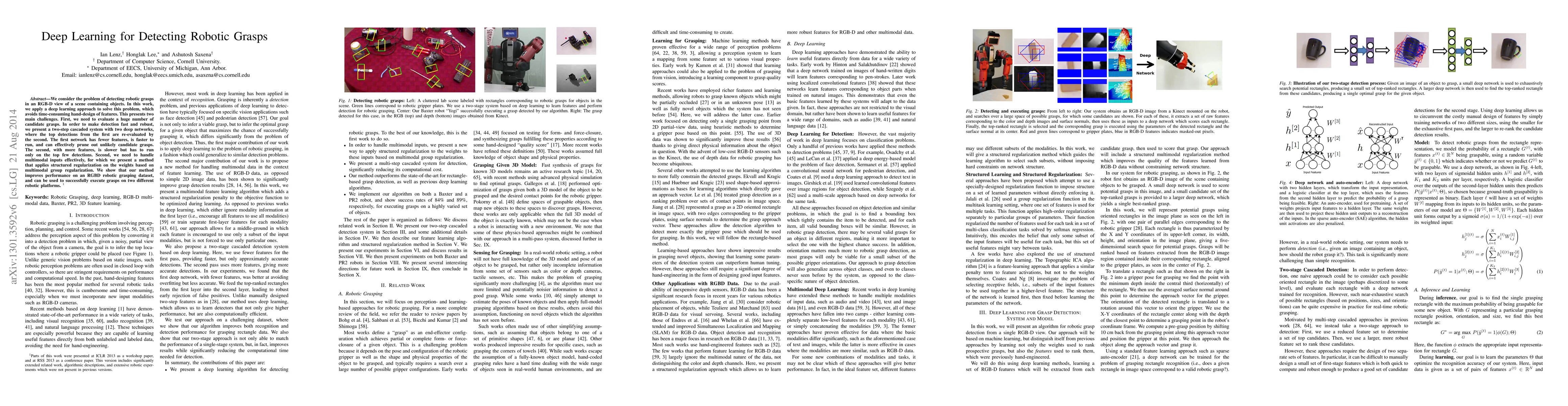 This paper proposes a deep learning method for detecting robotic grasps in RGB-D scenes, utilizing a two-step cascaded network structure to efficiently evaluate numerous grasp candidates. It also introduces structured regularization to handle multimodal inputs, achieving superior performance compared to previous methods.
