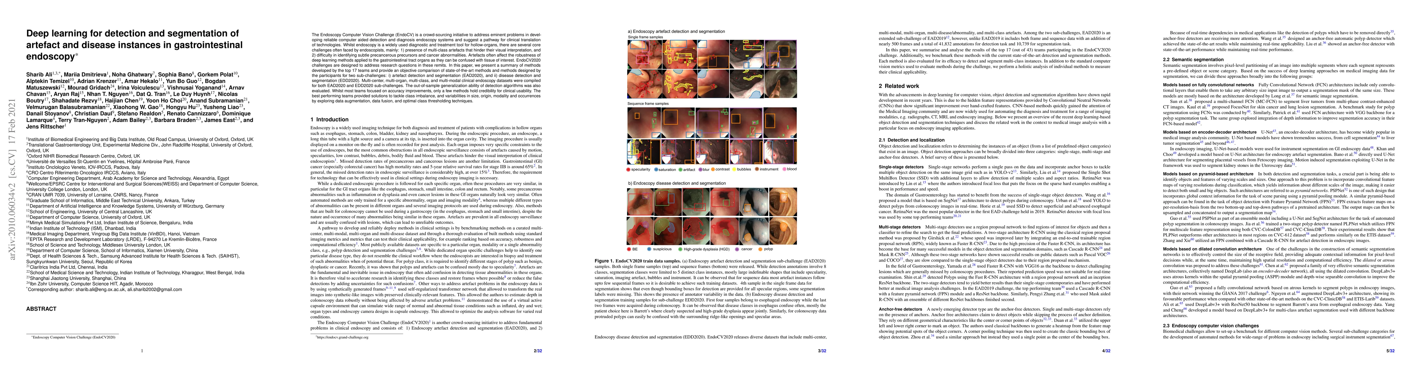 This paper summarizes methods from top teams in the EndoCV2020 challenge, focusing on deep learning for artefact and disease detection in gastrointestinal endoscopy. It compares state-of-the-art and participant-developed techniques for artefact and disease detection and segmentation, highlighting the challenges of class imbalance and variability.
