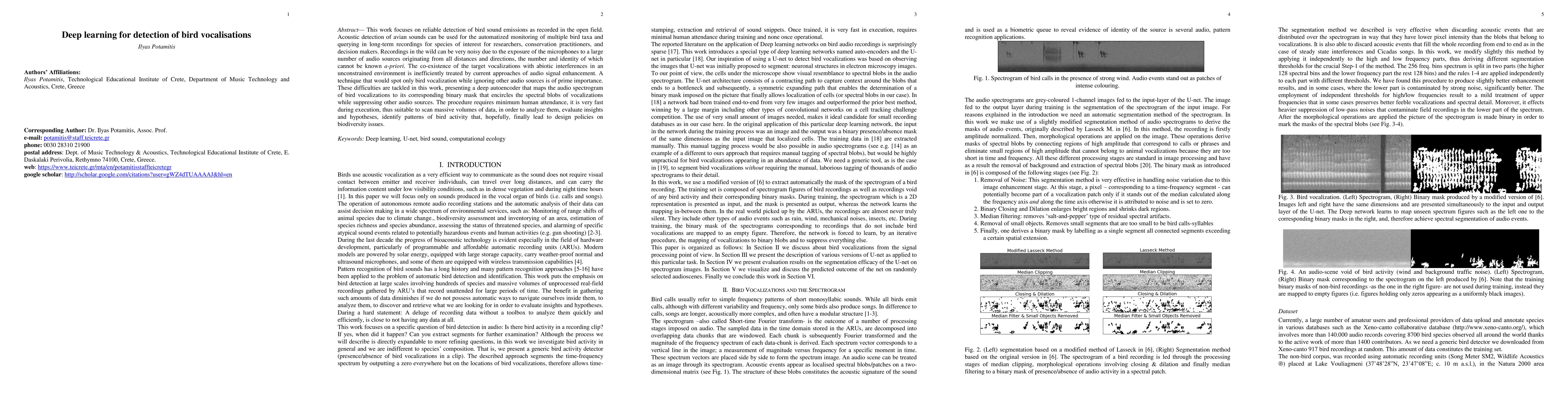 This paper proposes a deep autoencoder for detecting bird vocalizations in noisy field recordings, creating binary masks that isolate bird sounds while suppressing other audio sources, facilitating automated monitoring and biodiversity policy design. The method is efficient, requiring minimal human intervention and suitable for large-scale data analysis.