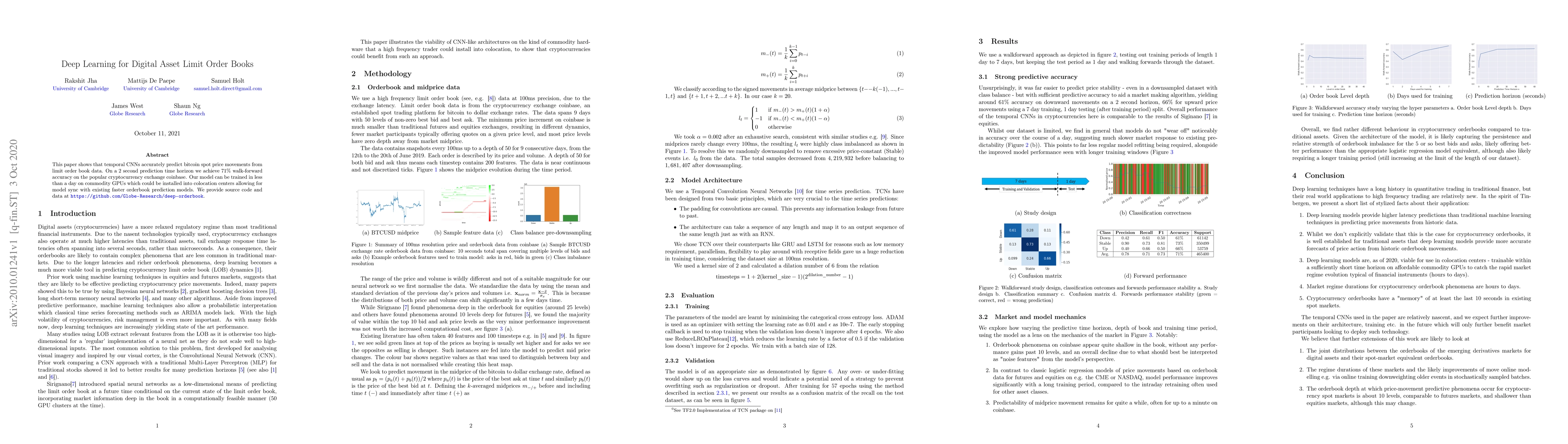 Researchers used deep learning to predict Bitcoin spot prices from limit order book data with 71% accuracy on a 2-second prediction time horizon. This model can be trained quickly on commodity GPUs and synced with existing models for real-time predictions.