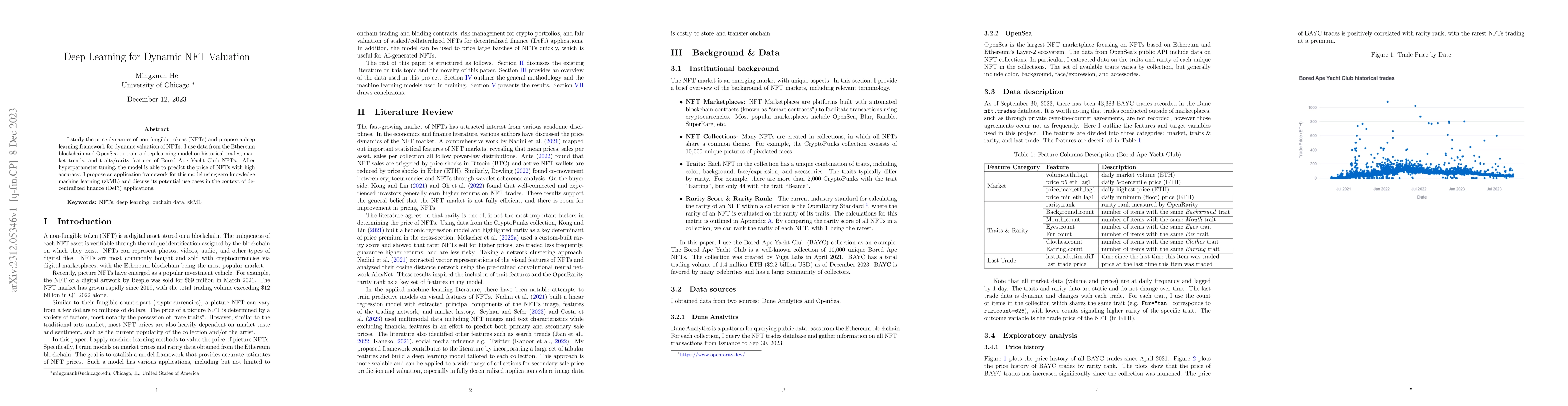This paper proposes a deep learning framework for dynamic valuation of NFTs using historical trade data and traits from Ethereum blockchain. The model, trained on Bored Ape Yacht Club NFTs, achieves high accuracy in price prediction and explores its application in decentralized finance via zero-knowledge machine learning.