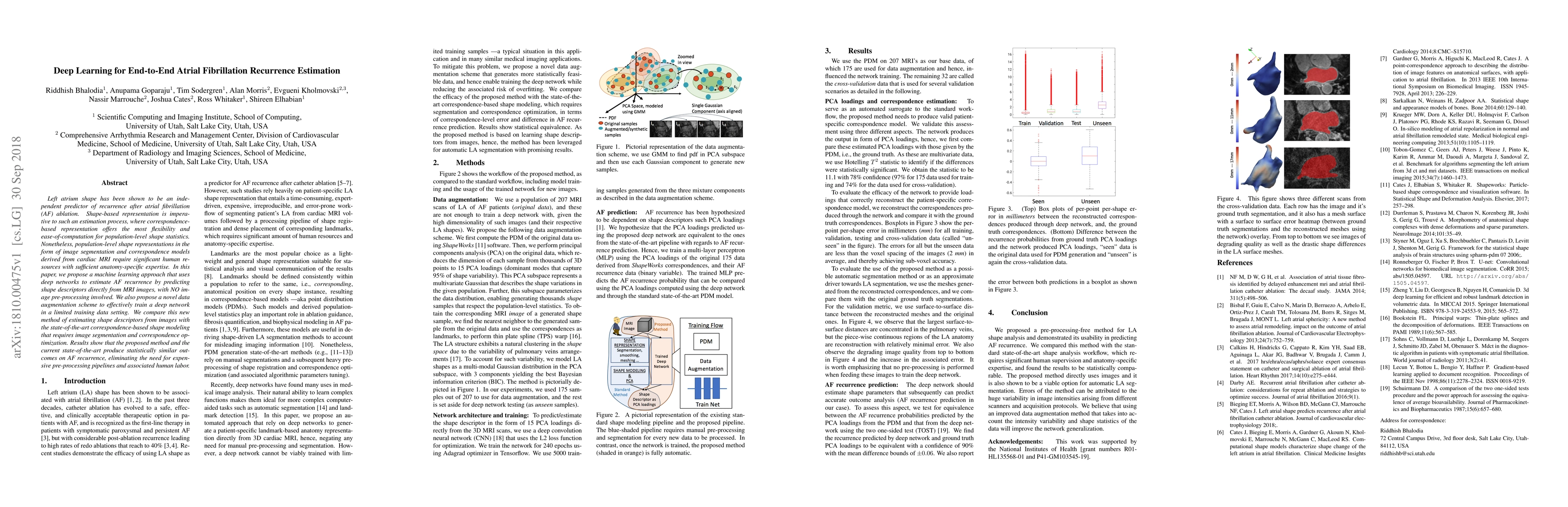 Left atrium shape has been shown to be an independent predictor of recurrence after atrial fibrillation (AF) ablation. Shape-based representation is imperative to such an estimation process, where correspondence-based representation offers the most flexibility and ease-of-computation for population-level shape statistics. Nonetheless, population-level shape representations in the form of image segmentation and correspondence models derived from cardiac MRI require significant human resources with sufficient anatomy-specific expertise. In this paper, we propose a machine learning approach that uses deep networks to estimate AF recurrence by predicting shape descriptors directly from MRI images, with NO image pre-processing involved. We also propose a novel data augmentation scheme to effectively train a deep network in a limited training data setting. We compare this new method of estimating shape descriptors from images with the state-of-the-art correspondence-based shape modeling that requires image segmentation and correspondence optimization. Results show that the proposed method and the current state-of-the-art produce statistically similar outcomes on AF recurrence, eliminating the need for expensive pre-processing pipelines and associated human labor.