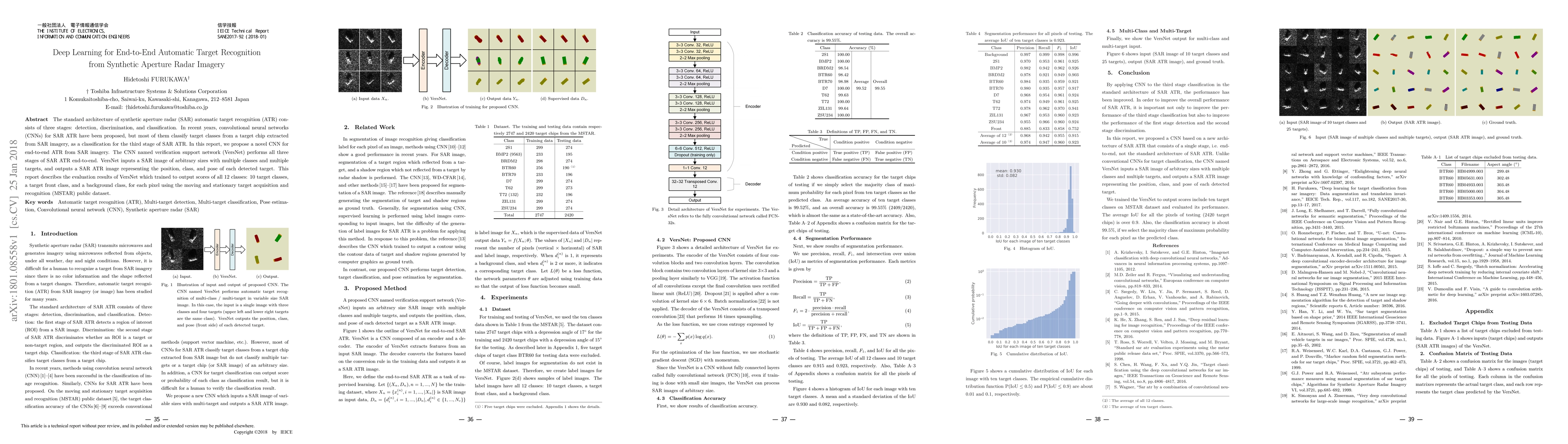 The standard architecture of synthetic aperture radar (SAR) automatic target recognition (ATR) consists of three stages: detection, discrimination, and classification. In recent years, convolutional neural networks (CNNs) for SAR ATR have been proposed, but most of them classify target classes from a target chip extracted from SAR imagery, as a classification for the third stage of SAR ATR. In this report, we propose a novel CNN for end-to-end ATR from SAR imagery. The CNN named verification support network (VersNet) performs all three stages of SAR ATR end-to-end. VersNet inputs a SAR image of arbitrary sizes with multiple classes and multiple targets, and outputs a SAR ATR image representing the position, class, and pose of each detected target. This report describes the evaluation results of VersNet which trained to output scores of all 12 classes: 10 target classes, a target front class, and a background class, for each pixel using the moving and stationary target acquisition and recognition (MSTAR) public dataset.