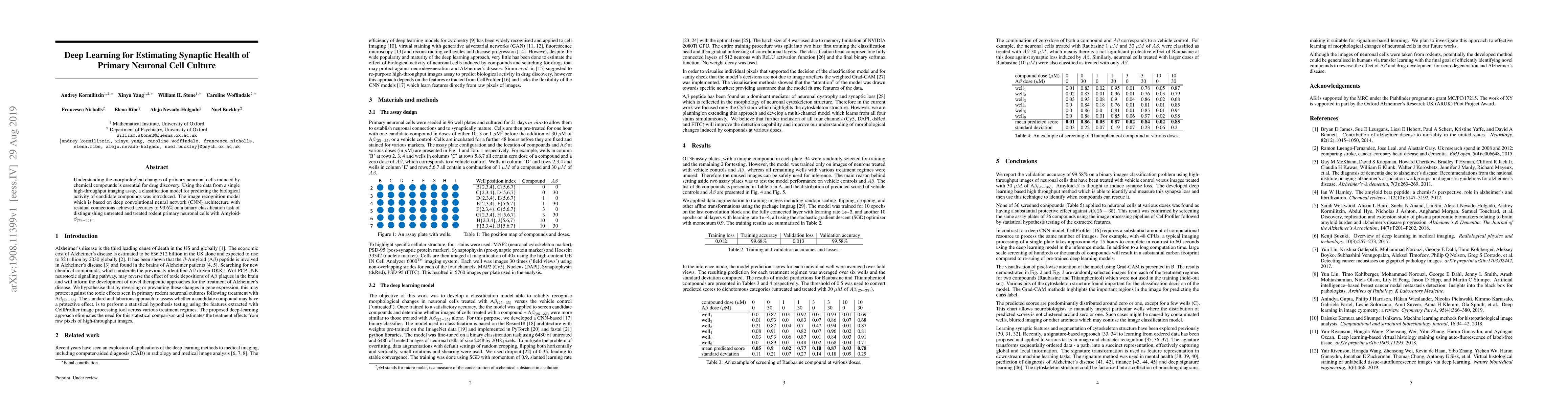 Understanding the morphological changes of primary neuronal cells induced by chemical compounds is essential for drug discovery. Using the data from a single high-throughput imaging assay, a classification model for predicting the biological activity of candidate compounds was introduced. The image recognition model which is based on deep convolutional neural network (CNN) architecture with residual connections achieved accuracy of 99.6$\%$ on a binary classification task of distinguishing untreated and treated rodent primary neuronal cells with Amyloid-$\beta_{(25-35)}$.