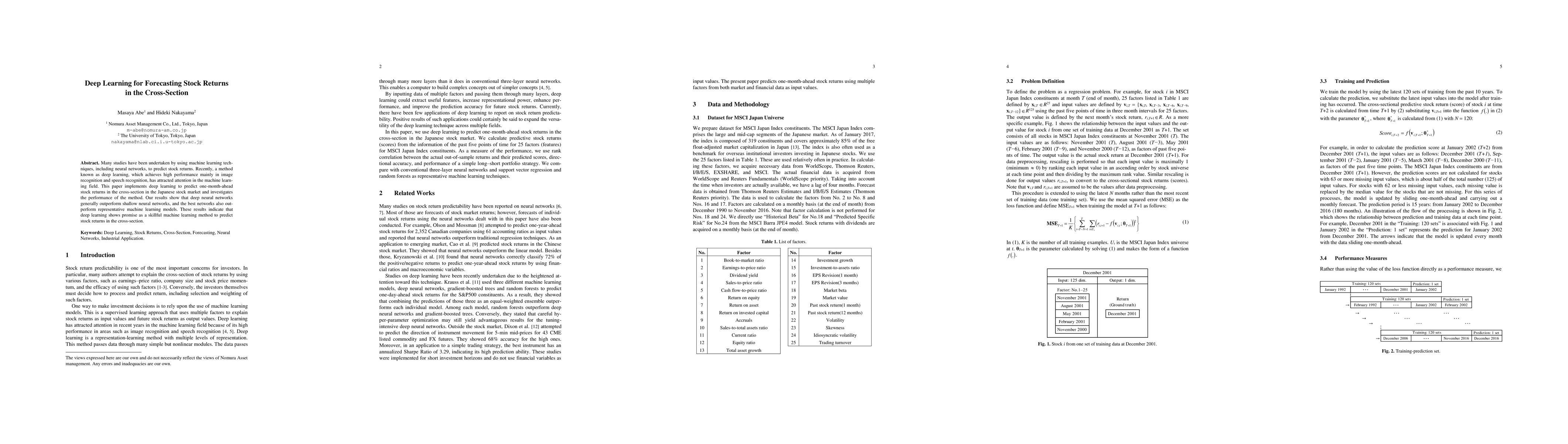 This paper applies deep learning techniques to forecast one-month-ahead stock returns in the Japanese market, finding that deep neural networks outperform both shallow neural networks and traditional machine learning models. The results suggest deep learning's potential for predicting cross-sectional stock returns.