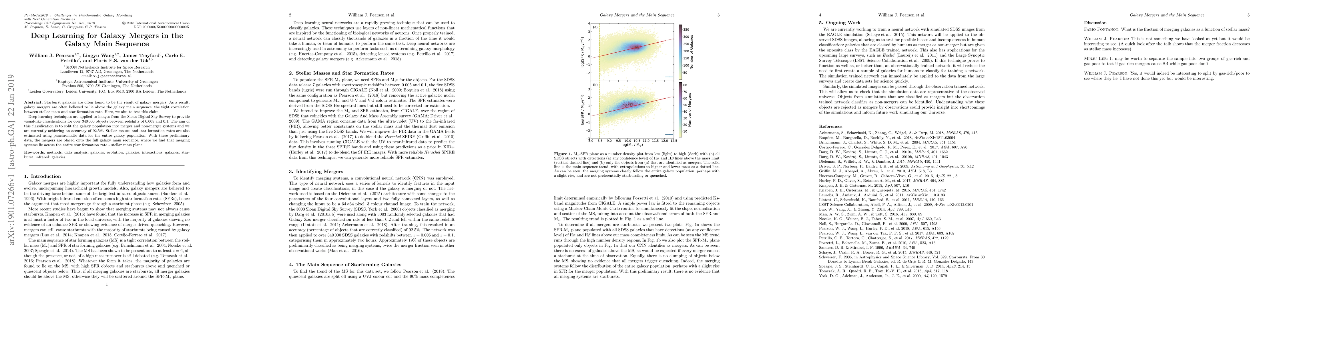 This study uses deep learning to classify galaxy mergers from Sloan Digital Sky Survey images, achieving 91.5% accuracy. The research finds that merging galaxies are distributed across the galaxy main sequence, challenging the notion that mergers lie above this correlation.