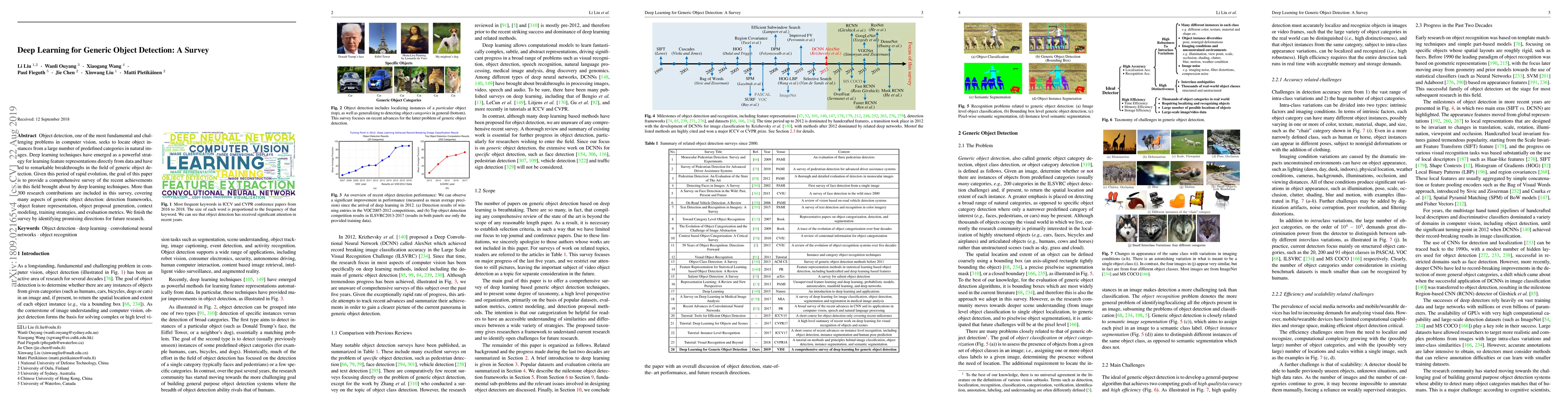 Object detection, one of the most fundamental and challenging problems in computer vision, seeks to locate object instances from a large number of predefined categories in natural images. Deep learning techniques have emerged as a powerful strategy for learning feature representations directly from data and have led to remarkable breakthroughs in the field of generic object detection. Given this period of rapid evolution, the goal of this paper is to provide a comprehensive survey of the recent achievements in this field brought about by deep learning techniques. More than 300 research contributions are included in this survey, covering many aspects of generic object detection: detection frameworks, object feature representation, object proposal generation, context modeling, training strategies, and evaluation metrics. We finish the survey by identifying promising directions for future research.