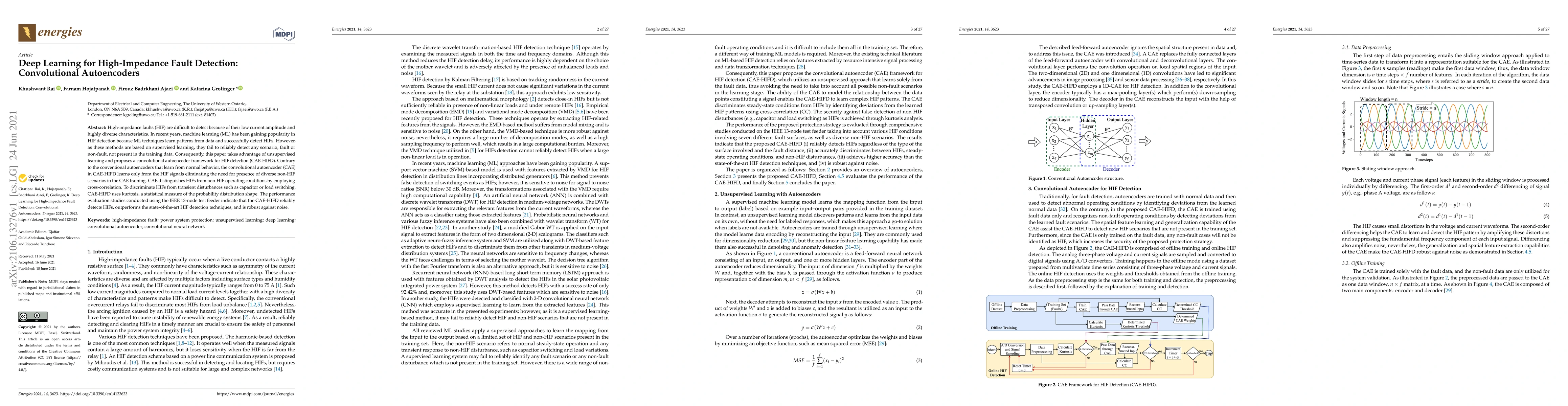 This paper proposes a convolutional autoencoder framework for detecting high-impedance faults (HIF) using unsupervised learning, eliminating the need for diverse non-HIF training data. The CAE-HIFD method reliably identifies HIFs by employing cross-correlation and kurtosis to distinguish them from transient disturbances, outperforming existing techniques.