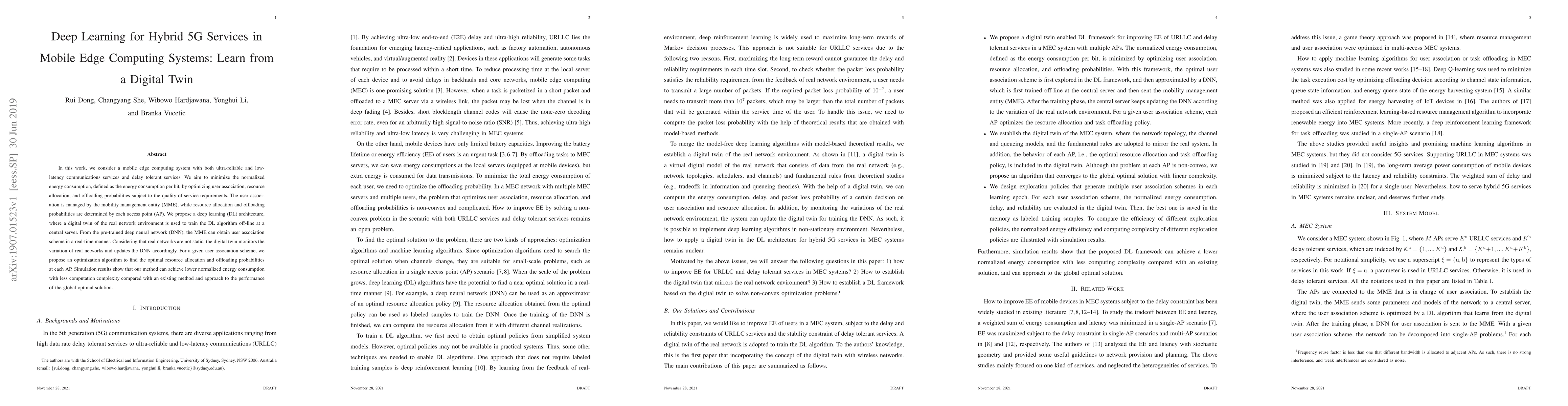 This paper proposes a deep learning architecture for optimizing energy consumption in hybrid 5G services using mobile edge computing, leveraging a digital twin to train the model off-line. The method achieves lower energy consumption and less computational complexity compared to existing methods.