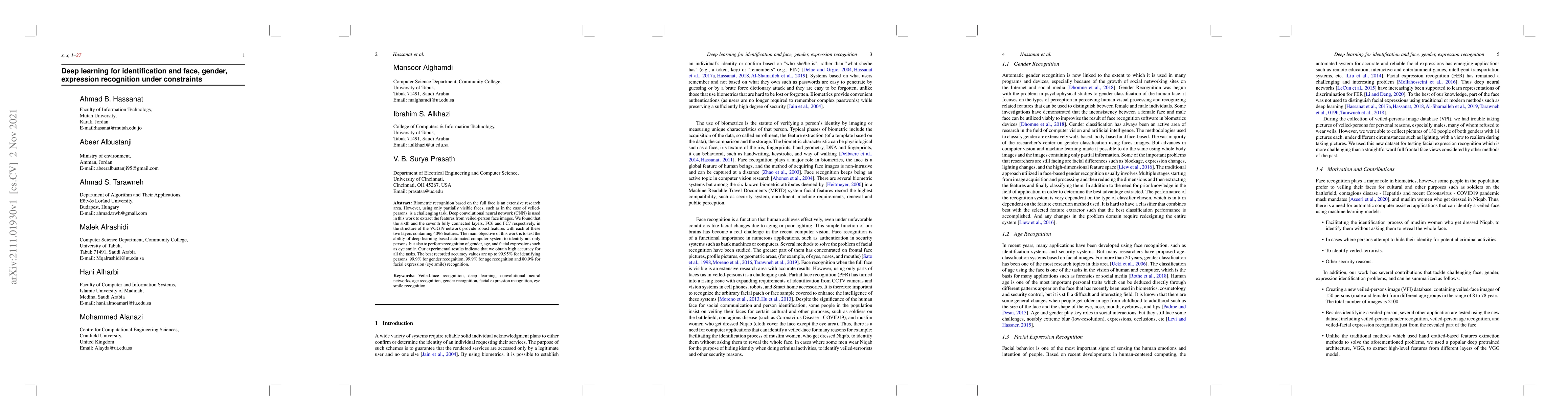 Biometric recognition based on the full face is an extensive research area. However, using only partially visible faces, such as in the case of veiled-persons, is a challenging task. Deep convolutional neural network (CNN) is used in this work to extract the features from veiled-person face images. We found that the sixth and the seventh fully connected layers, FC6 and FC7 respectively, in the structure of the VGG19 network provide robust features with each of these two layers containing 4096 features. The main objective of this work is to test the ability of deep learning based automated computer system to identify not only persons, but also to perform recognition of gender, age, and facial expressions such as eye smile. Our experimental results indicate that we obtain high accuracy for all the tasks. The best recorded accuracy values are up to 99.95% for identifying persons, 99.9% for gender recognition, 99.9% for age recognition and 80.9% for facial expression (eye smile) recognition.