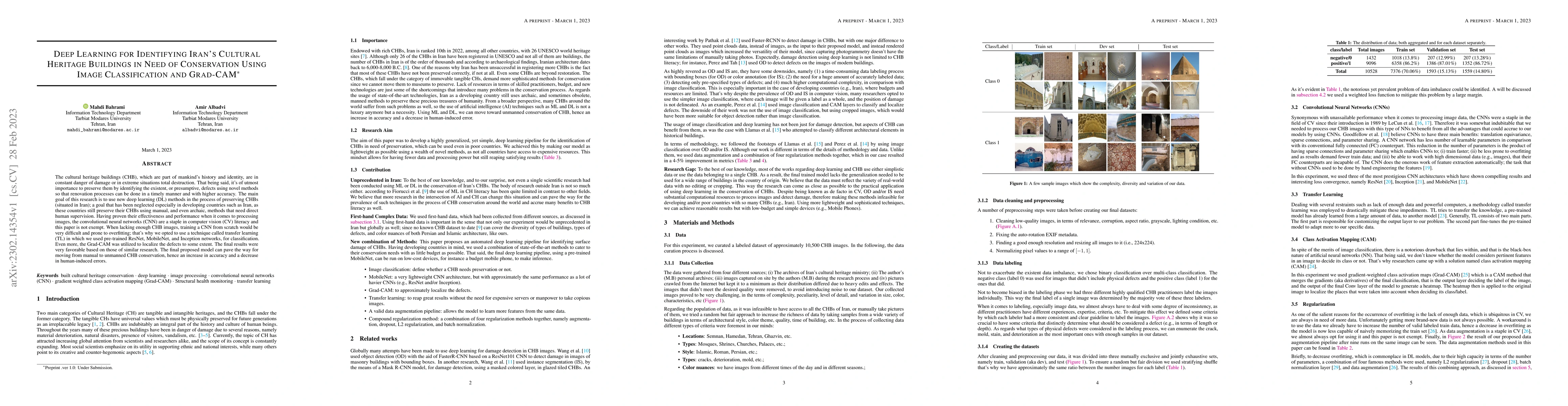 This research employs deep learning techniques, specifically convolutional neural networks (CNN) and transfer learning, to identify cultural heritage buildings in Iran that require conservation. Grad-CAM is used to localize defects, demonstrating the potential to shift from manual inspection to automated, accurate conservation methods.
