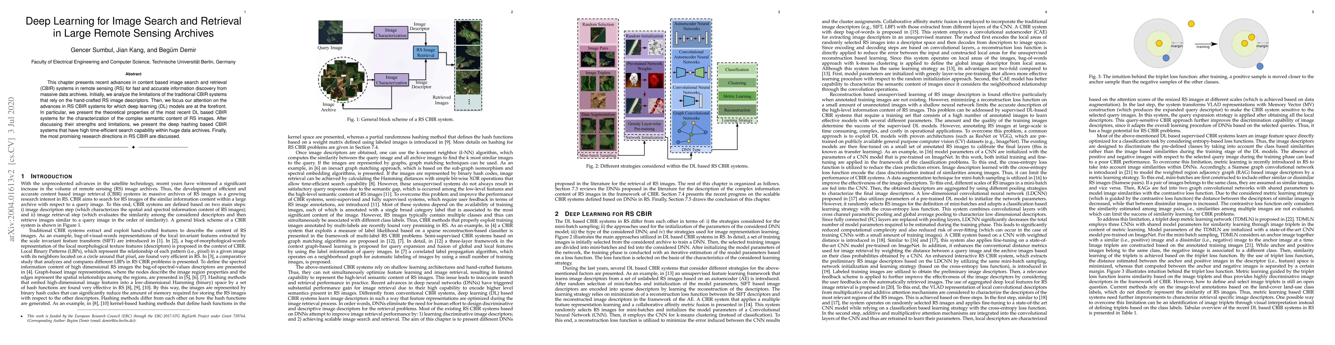 This chapter presents recent advances in content based image search and retrieval (CBIR) systems in remote sensing (RS) for fast and accurate information discovery from massive data archives. Initially, we analyze the limitations of the traditional CBIR systems that rely on the hand-crafted RS image descriptors. Then, we focus our attention on the advances in RS CBIR systems for which deep learning (DL) models are at the forefront. In particular, we present the theoretical properties of the most recent DL based CBIR systems for the characterization of the complex semantic content of RS images. After discussing their strengths and limitations, we present the deep hashing based CBIR systems that have high time-efficient search capability within huge data archives. Finally, the most promising research directions in RS CBIR are discussed.