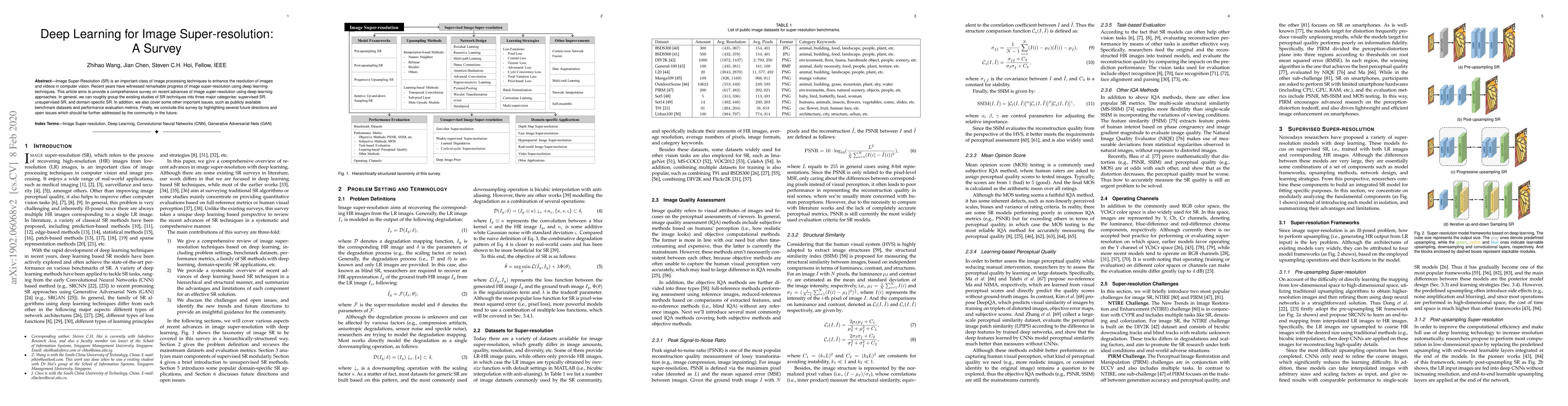 This paper surveys recent advances in deep learning techniques for image super-resolution, categorizing methods into supervised, unsupervised, and domain-specific approaches. It also discusses benchmark datasets and evaluation metrics, and concludes with future research directions.
