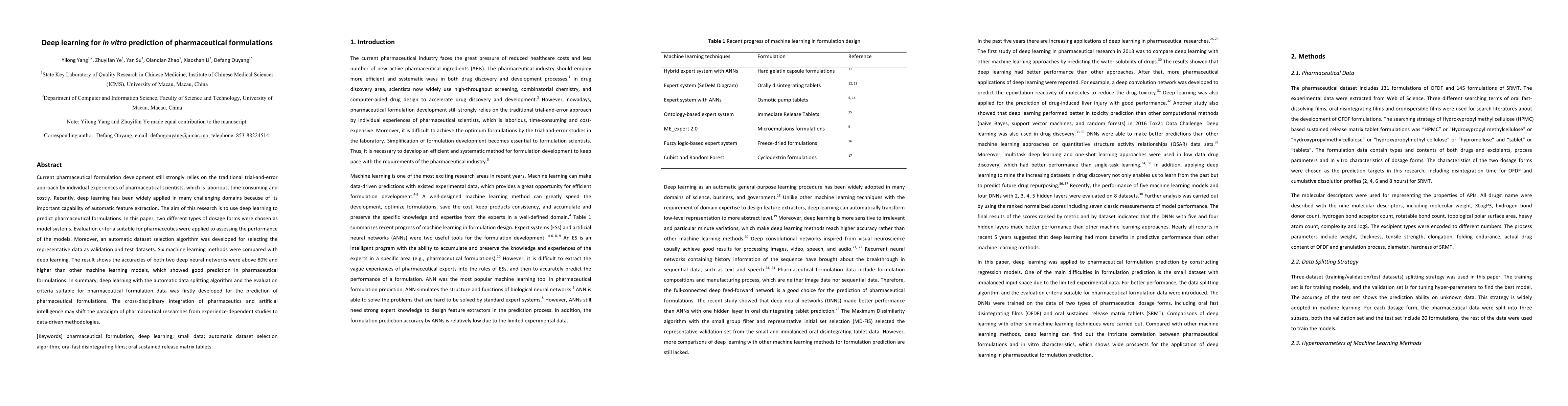 This paper explores the application of deep learning to predict pharmaceutical formulations, demonstrating superior accuracy over traditional machine learning methods. The study introduces an automatic dataset selection algorithm and shows that deep learning models achieve over 80% accuracy, suggesting a potential shift towards data-driven pharmaceutical research.