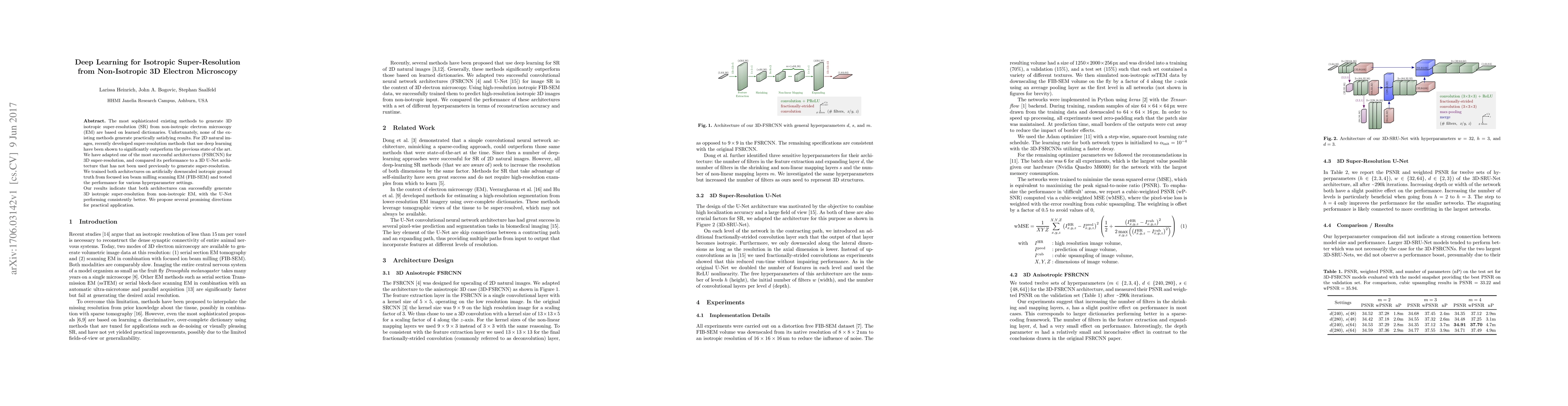 This paper adapts successful 2D deep learning architectures, FSRCNN and 3D U-Net, for generating 3D isotropic super-resolution from non-isotropic electron microscopy data. The U-Net architecture outperforms FSRCNN, indicating potential for practical applications in EM imaging.