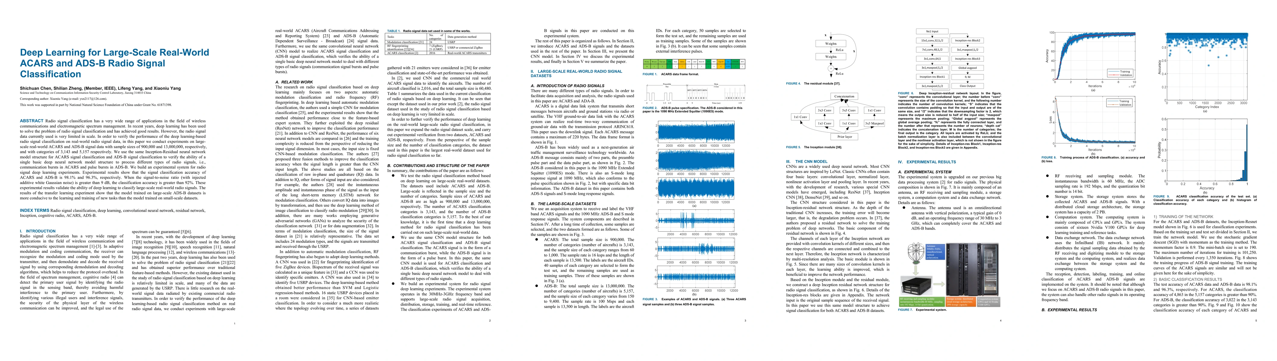 This paper explores the application of deep learning for classifying large-scale real-world ACARS and ADS-B radio signals, achieving high accuracy of 98.1% and 96.3% respectively. The study validates the effectiveness of deep learning in handling diverse radio signal types and demonstrates that models trained on larger datasets perform better in transfer learning tasks.