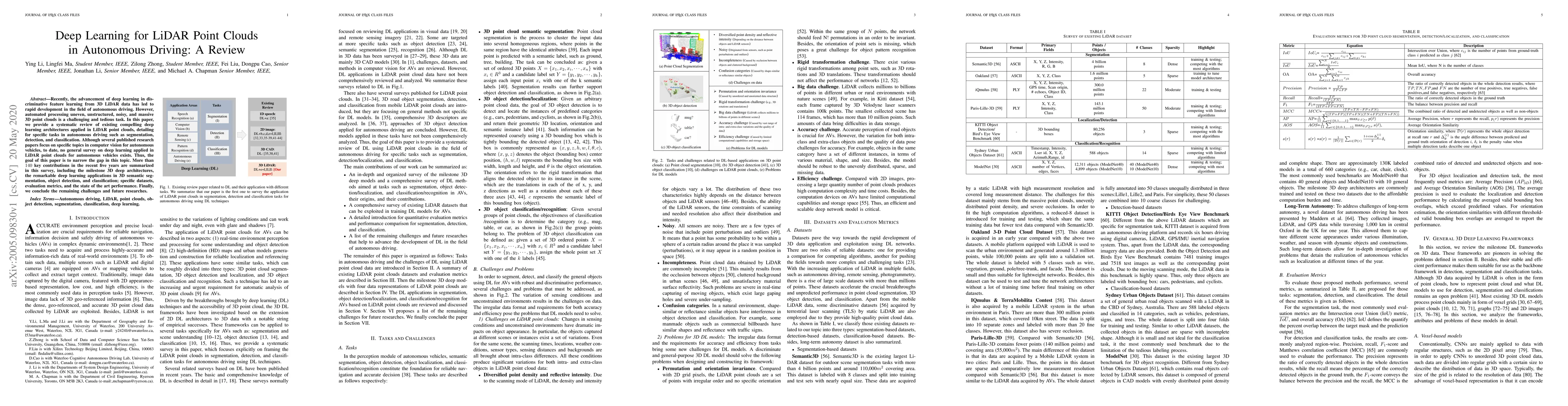 This paper provides a systematic review of deep learning architectures applied to LiDAR point clouds for autonomous driving tasks such as segmentation, detection, and classification. It summarizes over 140 key contributions in recent years, detailing milestone 3D deep architectures, applications, datasets, evaluation metrics, and state-of-the-art performance.