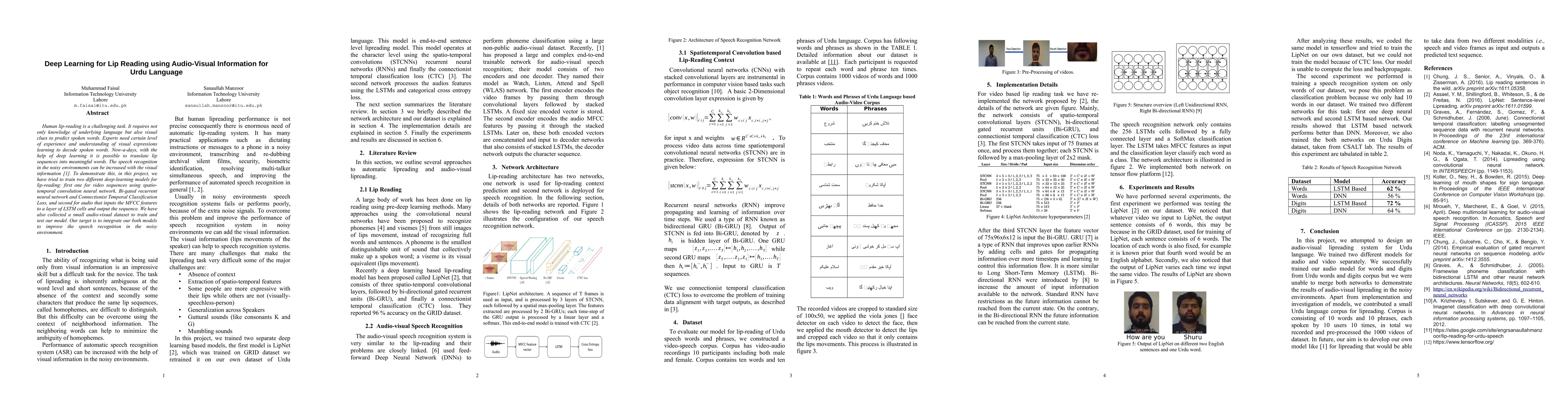 This research explores deep learning techniques for lip-reading in Urdu, employing both visual and audio information to improve speech recognition. The study trains two deep-learning models: one for video sequences using spatiotemporal CNN and Bi-Gated RNN, and another for audio using MFCC features and LSTM, aiming to enhance recognition in noisy environments.