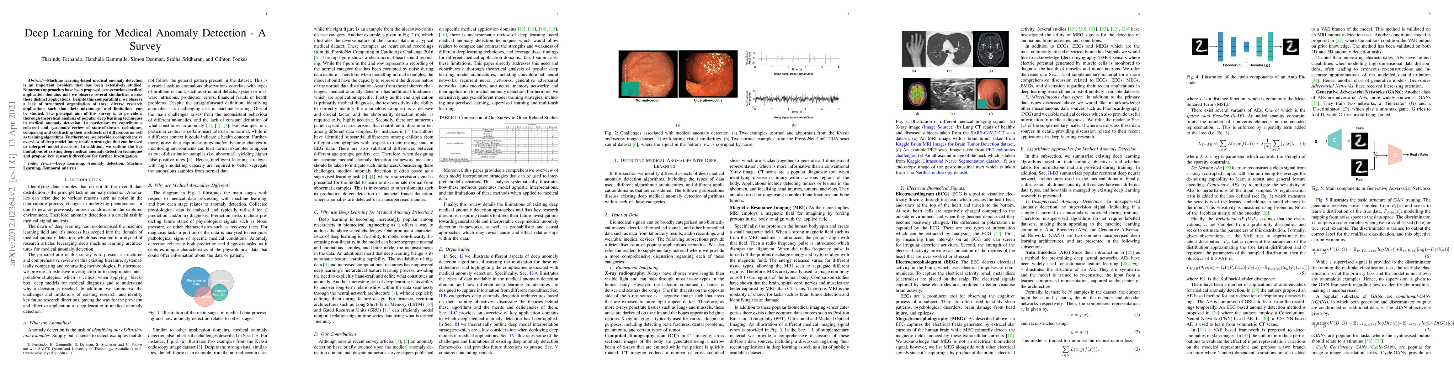 This paper surveys deep learning techniques for medical anomaly detection, offering a systematic review of state-of-the-art methods, their architectural differences, and training algorithms. It also discusses model interpretation strategies and highlights limitations and future research directions in the field.