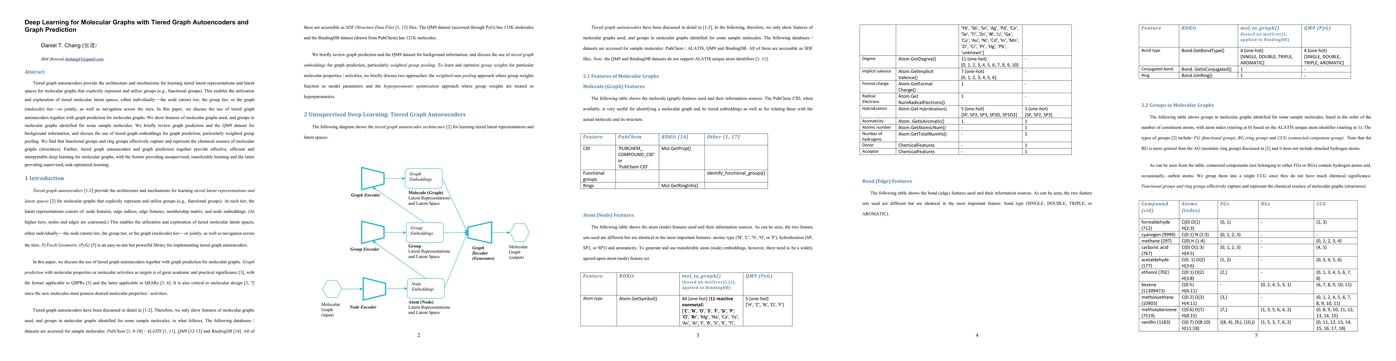 This paper explores the use of tiered graph autoencoders for learning hierarchical latent representations of molecular graphs, focusing on functional and ring groups. It combines this with graph prediction techniques to achieve effective, interpretable deep learning for molecular graph analysis.