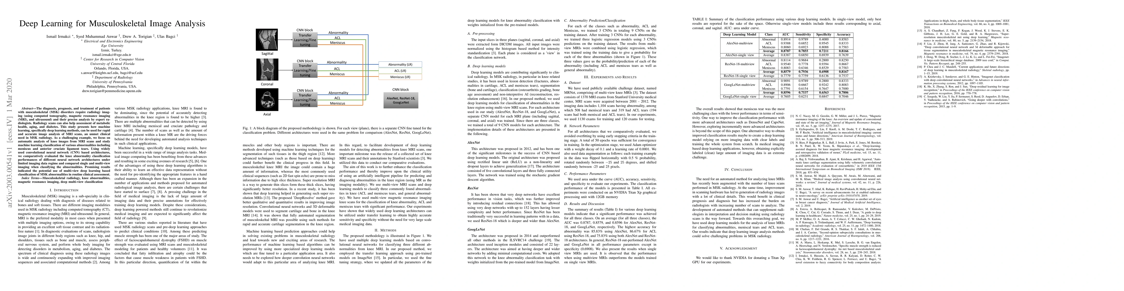 This study explores the application of deep learning, specifically convolutional neural networks (CNNs), for the automatic analysis of MRI scans to classify knee abnormalities, including meniscus and anterior cruciate ligament tears. The research demonstrates promising results for the potential use of multi-view deep learning in routine clinical assessment of musculoskeletal disorders.