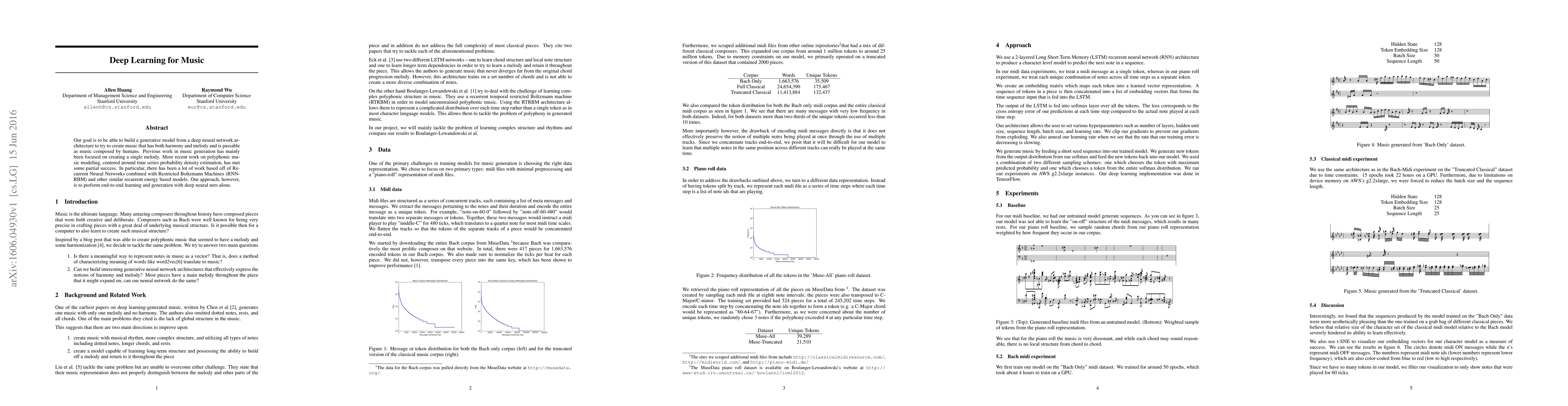 Our goal is to be able to build a generative model from a deep neural network architecture to try to create music that has both harmony and melody and is passable as music composed by humans. Previous work in music generation has mainly been focused on creating a single melody. More recent work on polyphonic music modeling, centered around time series probability density estimation, has met some partial success. In particular, there has been a lot of work based off of Recurrent Neural Networks combined with Restricted Boltzmann Machines (RNN-RBM) and other similar recurrent energy based models. Our approach, however, is to perform end-to-end learning and generation with deep neural nets alone.