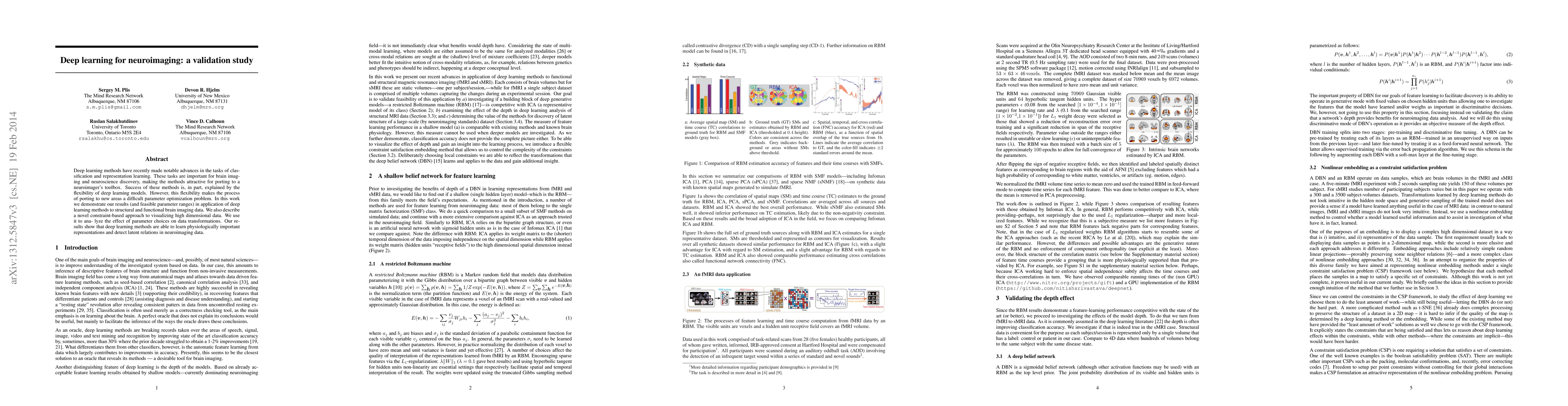 Deep learning methods have recently made notable advances in the tasks of classification and representation learning. These tasks are important for brain imaging and neuroscience discovery, making the methods attractive for porting to a neuroimager's toolbox. Success of these methods is, in part, explained by the flexibility of deep learning models. However, this flexibility makes the process of porting to new areas a difficult parameter optimization problem. In this work we demonstrate our results (and feasible parameter ranges) in application of deep learning methods to structural and functional brain imaging data. We also describe a novel constraint-based approach to visualizing high dimensional data. We use it to analyze the effect of parameter choices on data transformations. Our results show that deep learning methods are able to learn physiologically important representations and detect latent relations in neuroimaging data.