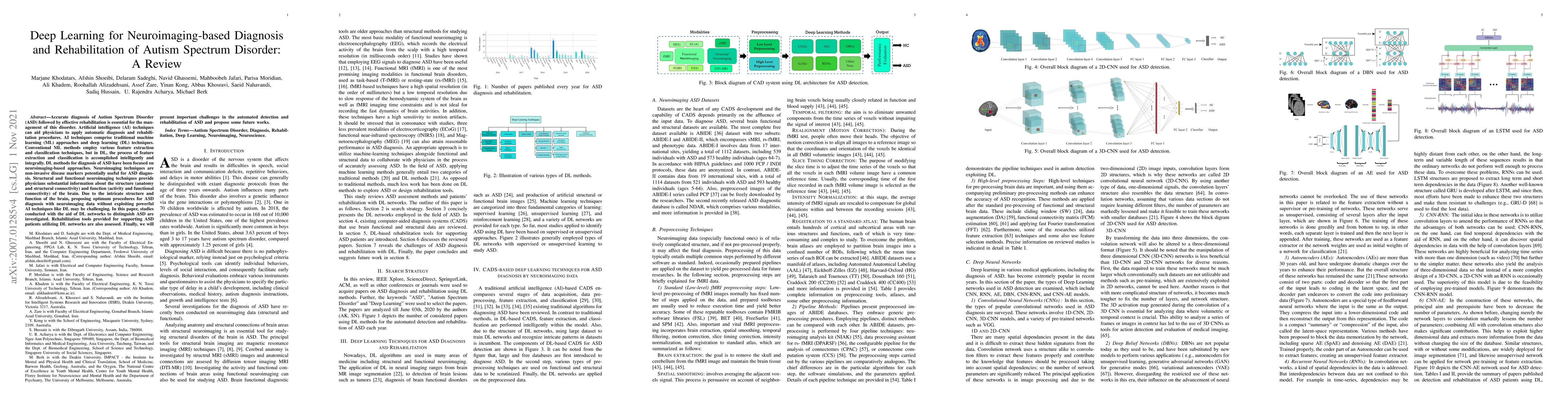This paper reviews deep learning techniques for diagnosing and rehabilitating Autism Spectrum Disorder (ASD) using neuroimaging data. It highlights the advantages of deep learning over traditional machine learning in processing neuroimaging data for ASD diagnosis and discusses rehabilitation tools developed with deep learning networks.