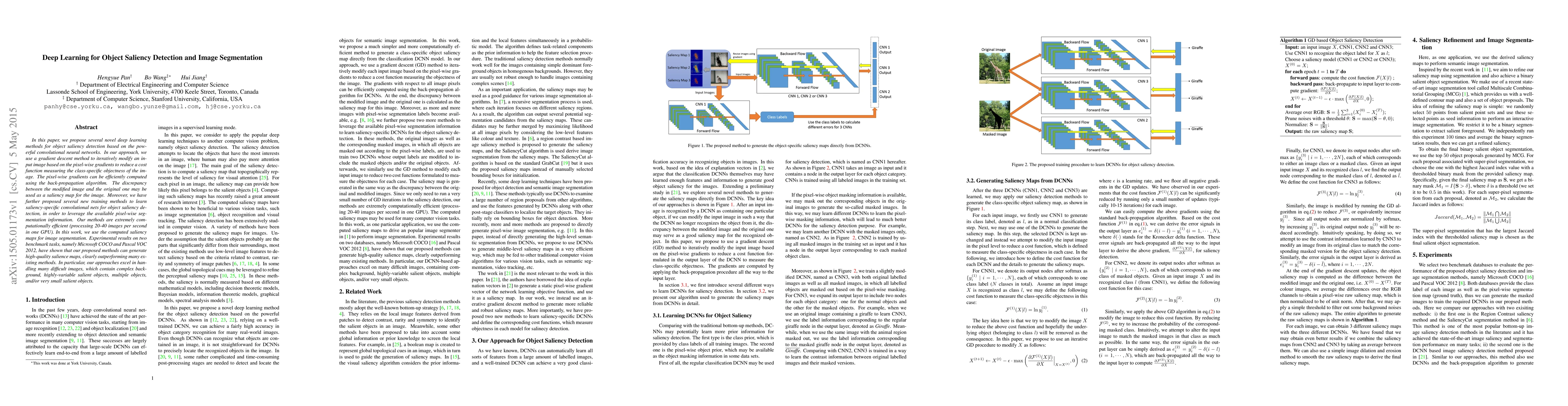 This paper introduces deep learning methods for object saliency detection and image segmentation using convolutional neural networks. The proposed approach iteratively modifies images to generate saliency maps, which are then used for efficient image segmentation, outperforming existing methods on benchmark datasets.