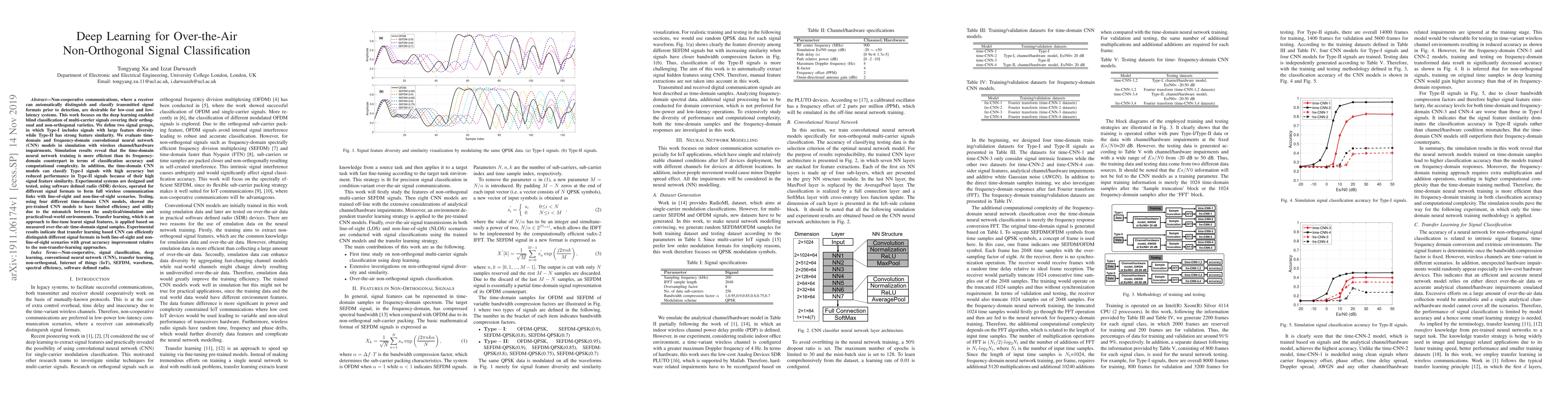 This research explores the use of deep learning for classifying non-orthogonal multi-carrier signals in wireless communication. Time-domain convolutional neural networks (CNNs) show superior efficiency and accuracy compared to frequency-domain CNNs, especially for signals with diverse features. However, practical testing with SDR devices reveals challenges due to the gap between simulation and real-world conditions, which are addressed effectively using transfer learning to fine-tune signal features.