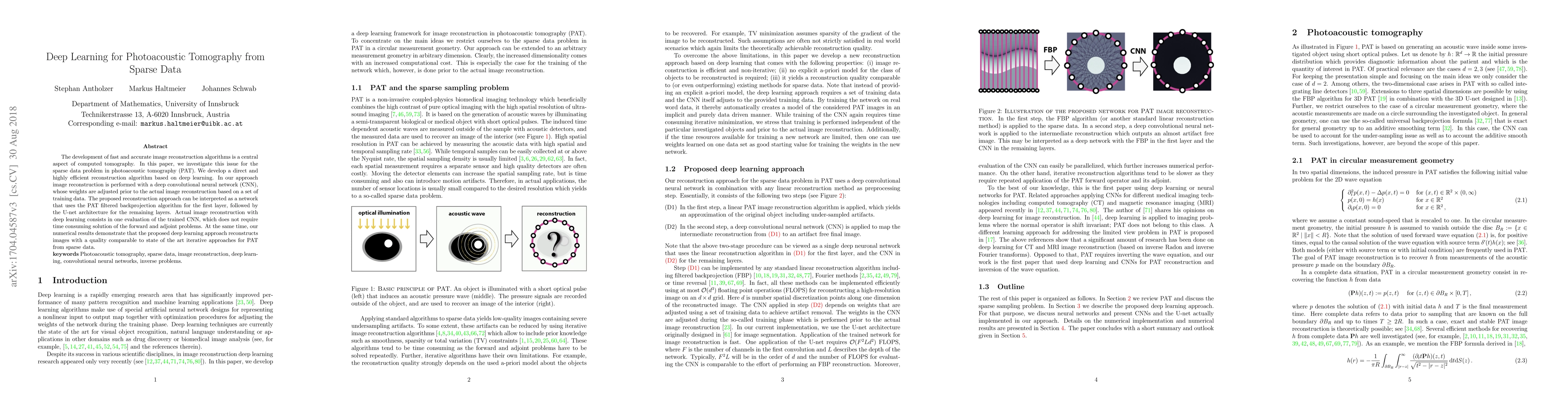 The development of fast and accurate image reconstruction algorithms is a central aspect of computed tomography. In this paper, we investigate this issue for the sparse data problem in photoacoustic tomography (PAT). We develop a direct and highly efficient reconstruction algorithm based on deep learning. In our approach image reconstruction is performed with a deep convolutional neural network (CNN), whose weights are adjusted prior to the actual image reconstruction based on a set of training data. The proposed reconstruction approach can be interpreted as a network that uses the PAT filtered backprojection algorithm for the first layer, followed by the U-net architecture for the remaining layers. Actual image reconstruction with deep learning consists in one evaluation of the trained CNN, which does not require time consuming solution of the forward and adjoint problems. At the same time, our numerical results demonstrate that the proposed deep learning approach reconstructs images with a quality comparable to state of the art iterative approaches for PAT from sparse data.