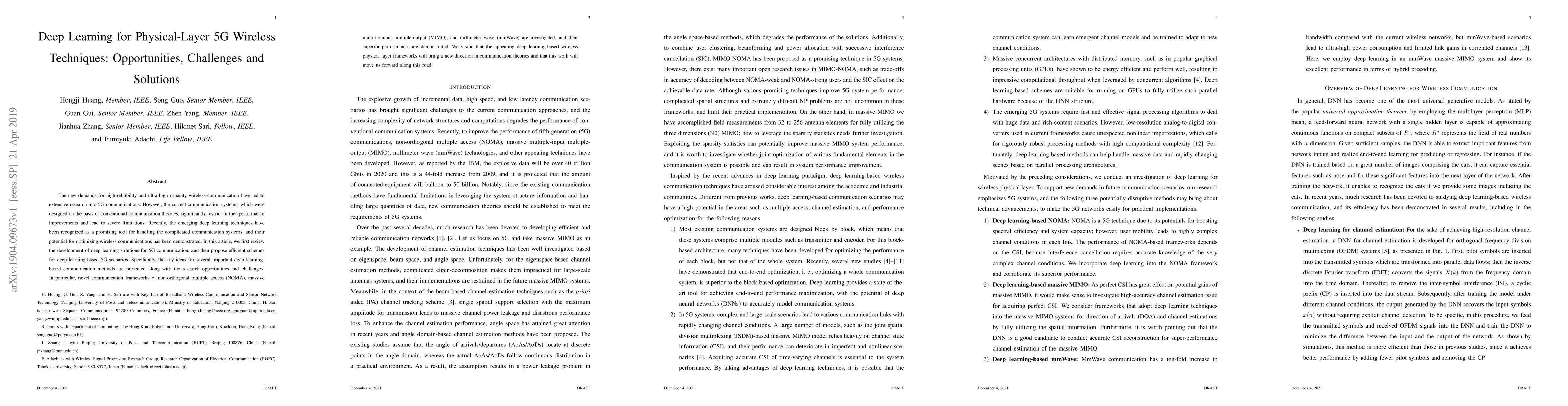 This work is novel in its comprehensive review and application of deep learning techniques to address key challenges in 5G communication systems, offering new directions in communication theories and practical implementations.