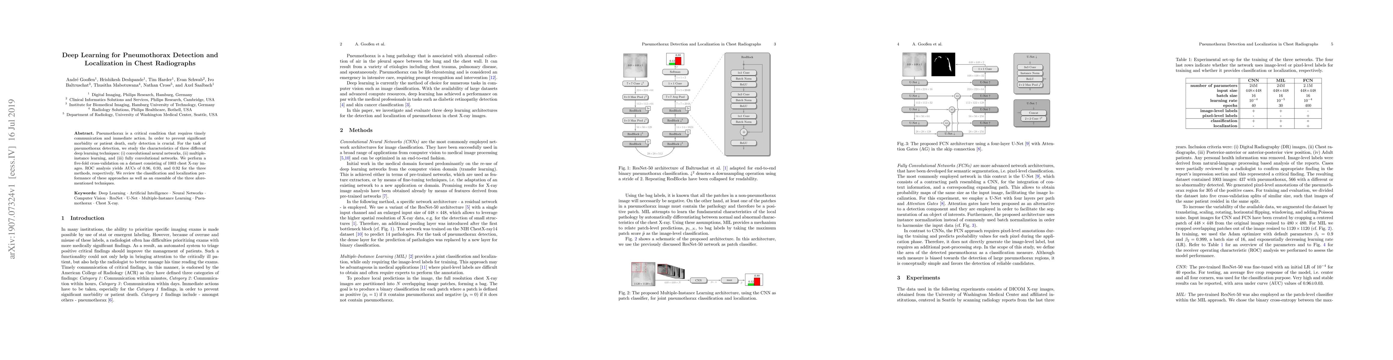 This research investigates the efficacy of three deep learning techniques—convolutional neural networks, multiple-instance learning, and fully convolutional networks—for detecting and localizing pneumothorax in chest X-rays. The study reports high AUC scores of 0.96, 0.93, and 0.92 respectively, and evaluates the classification and localization performance of these methods, along with an ensemble approach.
