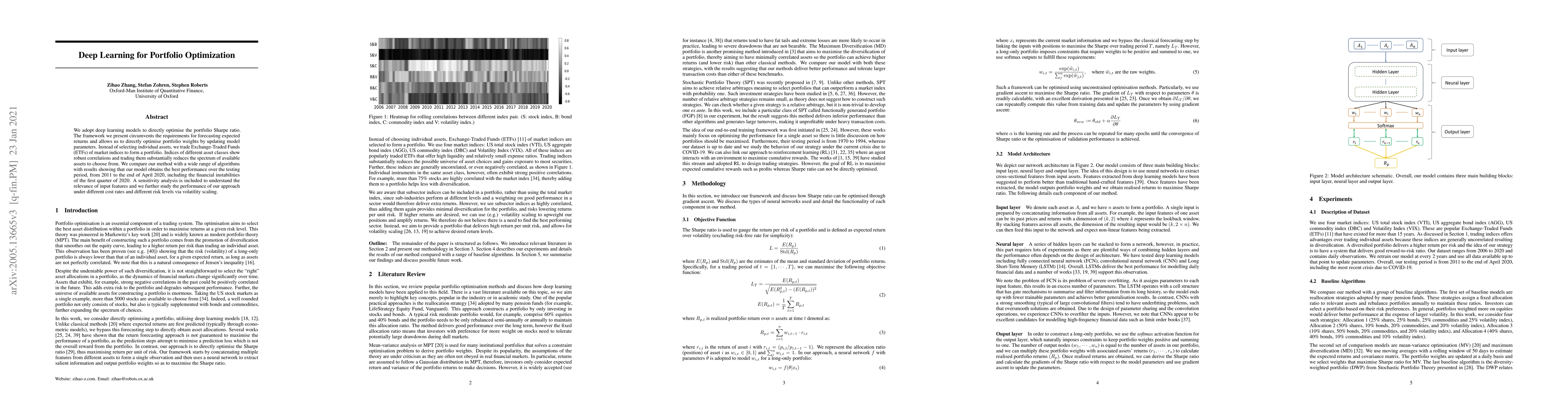 We adopt deep learning models to directly optimise the portfolio Sharpe ratio. The framework we present circumvents the requirements for forecasting expected returns and allows us to directly optimise portfolio weights by updating model parameters. Instead of selecting individual assets, we trade Exchange-Traded Funds (ETFs) of market indices to form a portfolio. Indices of different asset classes show robust correlations and trading them substantially reduces the spectrum of available assets to choose from. We compare our method with a wide range of algorithms with results showing that our model obtains the best performance over the testing period, from 2011 to the end of April 2020, including the financial instabilities of the first quarter of 2020. A sensitivity analysis is included to understand the relevance of input features and we further study the performance of our approach under different cost rates and different risk levels via volatility scaling.