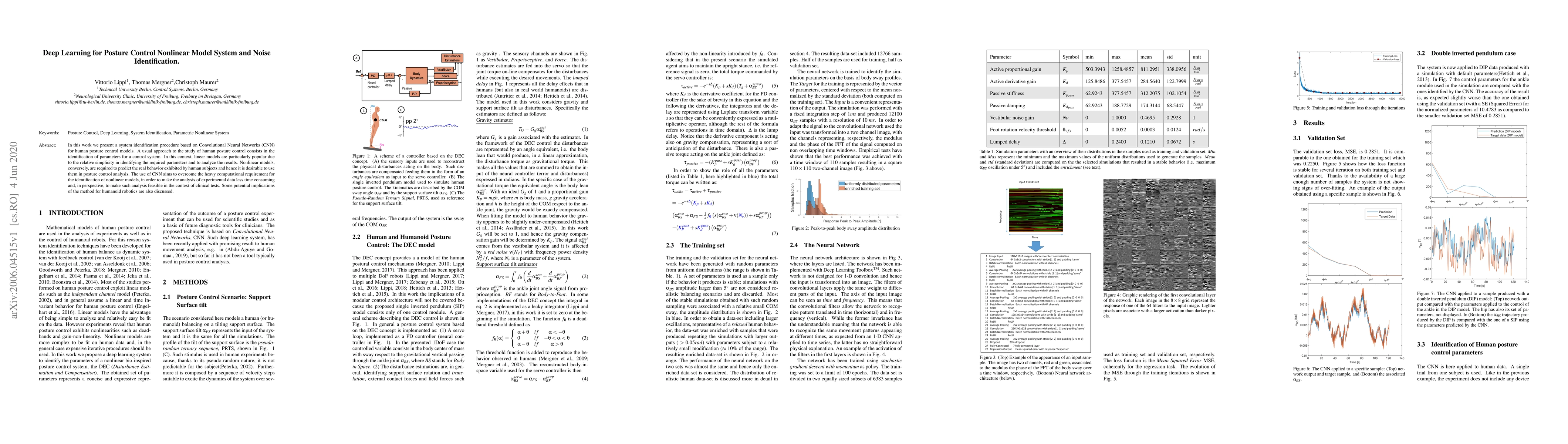 In this work we present a system identification procedure based on Convolutional Neural Networks (CNN) for human posture control models. A usual approach to the study of human posture control consists in the identification of parameters for a control system. In this context, linear models are particularly popular due to the relative simplicity in identifying the required parameters and to analyze the results. Nonlinear models, conversely, are required to predict the real behavior exhibited by human subjects and hence it is desirable to use them in posture control analysis. The use of CNN aims to overcome the heavy computational requirement for the identification of nonlinear models, in order to make the analysis of experimental data less time consuming and, in perspective, to make such analysis feasible in the context of clinical tests. Some potential implications of the method for humanoid robotics are also discussed.
