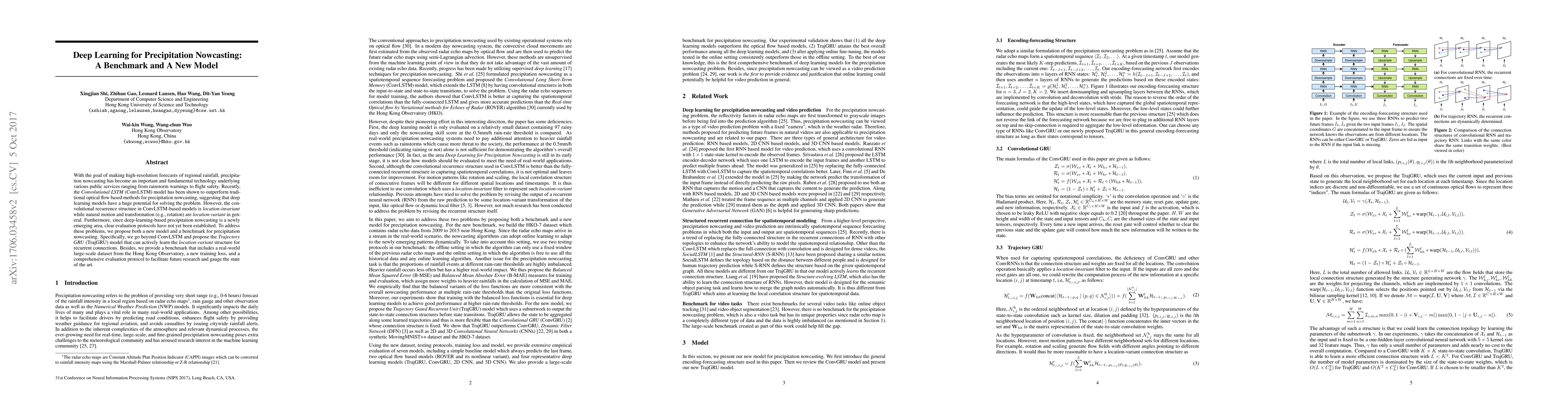 This paper proposes a new Trajectory GRU (TrajGRU) model for improved precipitation nowcasting, addressing the limitations of ConvLSTM's location-invariant structure. It also establishes a comprehensive benchmark with a large-scale dataset, a new training loss, and evaluation protocols to advance research in this emerging field.