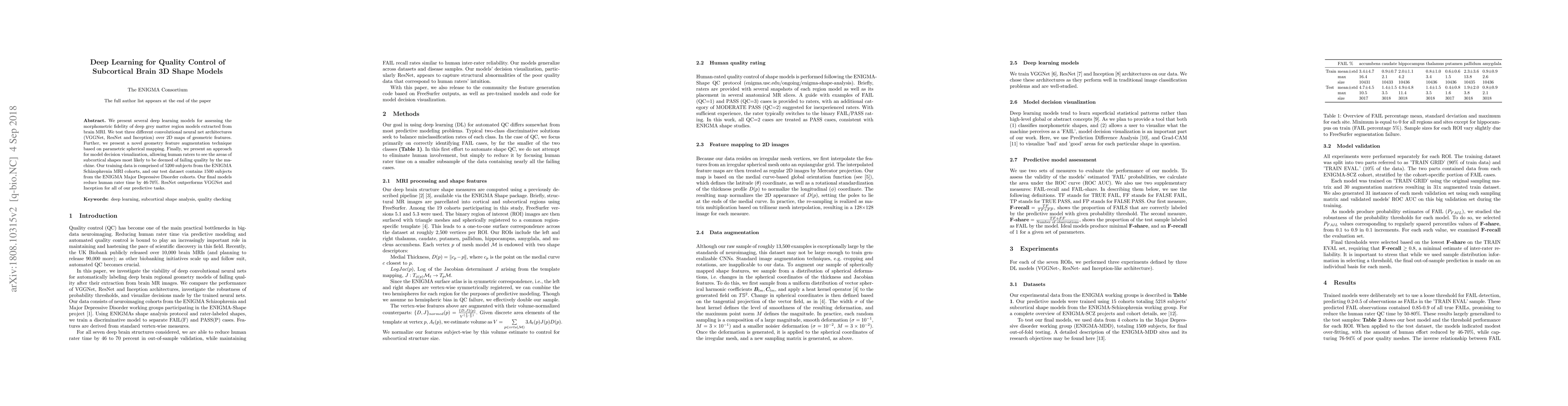 We present several deep learning models for assessing the morphometric fidelity of deep grey matter region models extracted from brain MRI. We test three different convolutional neural net architectures (VGGNet, ResNet and Inception) over 2D maps of geometric features. Further, we present a novel geometry feature augmentation technique based on a parametric spherical mapping. Finally, we present an approach for model decision visualization, allowing human raters to see the areas of subcortical shapes most likely to be deemed of failing quality by the machine. Our training data is comprised of 5200 subjects from the ENIGMA Schizophrenia MRI cohorts, and our test dataset contains 1500 subjects from the ENIGMA Major Depressive Disorder cohorts. Our final models reduce human rater time by 46-70%. ResNet outperforms VGGNet and Inception for all of our predictive tasks.