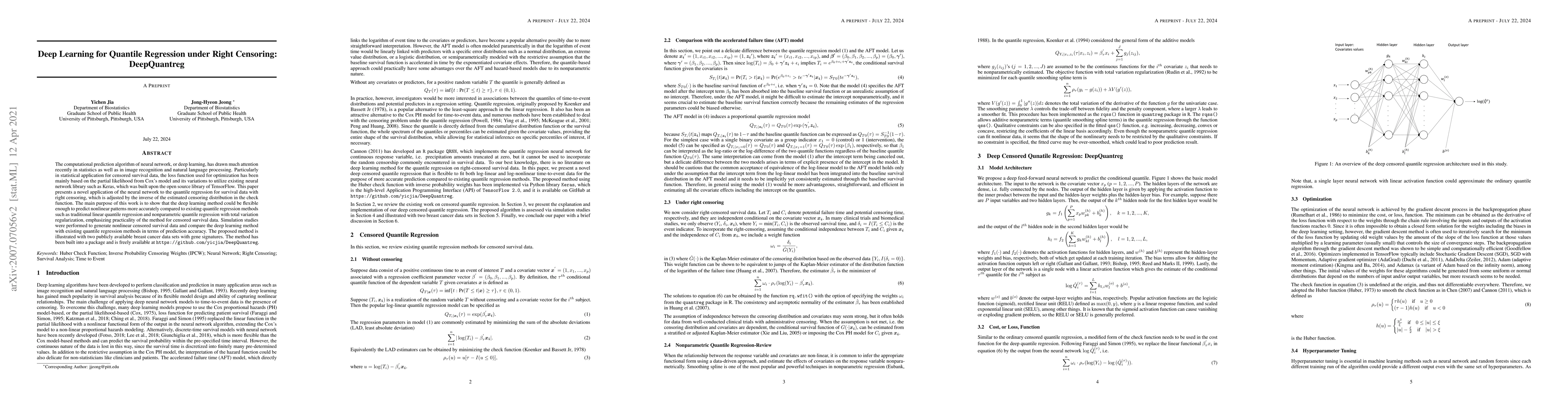 This paper introduces a deep learning approach for quantile regression in the context of right-censored survival data, demonstrating its flexibility and accuracy in predicting nonlinear patterns compared to traditional methods. The proposed DeepQuantreg method is showcased through simulations and real-world breast cancer datasets, and is available as an open-source package.