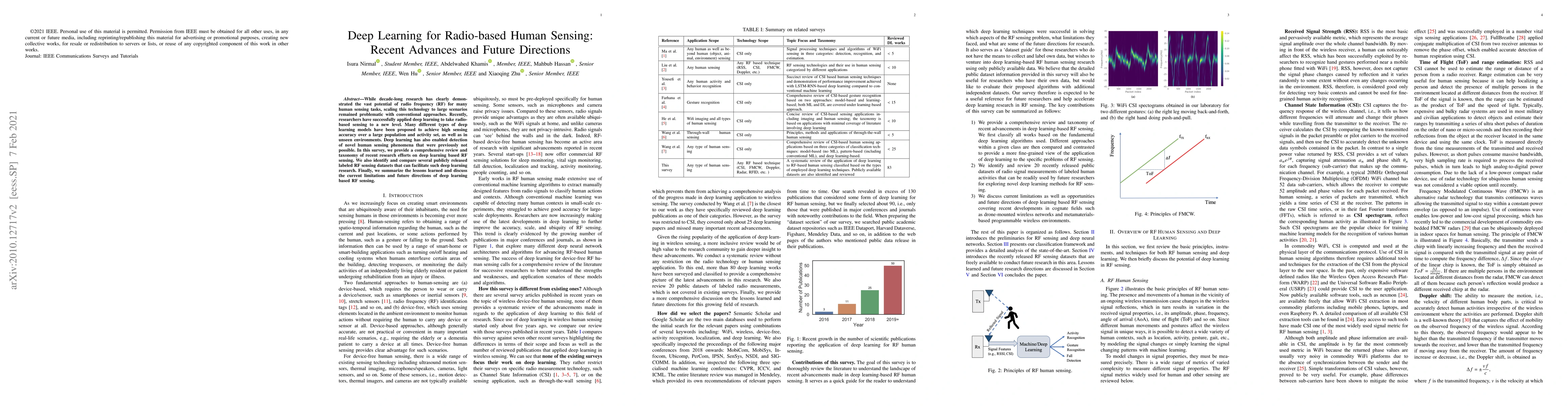 This paper surveys recent advances in deep learning applications for radio frequency (RF) human sensing, highlighting how deep learning models have improved accuracy and enabled novel detections. It also reviews publicly available RF sensing datasets and discusses current limitations and future research directions.