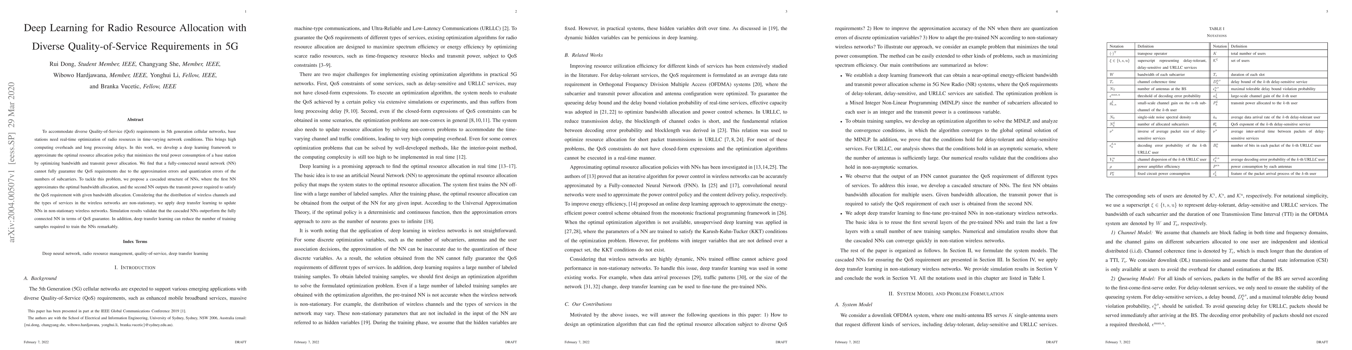 This paper proposes a deep learning framework for optimizing radio resource allocation in 5G networks to meet diverse QoS requirements. It introduces a cascaded neural network structure to better approximate optimal resource allocation, and employs deep transfer learning to handle non-stationary wireless conditions, achieving better QoS guarantees and reduced training sample requirements.