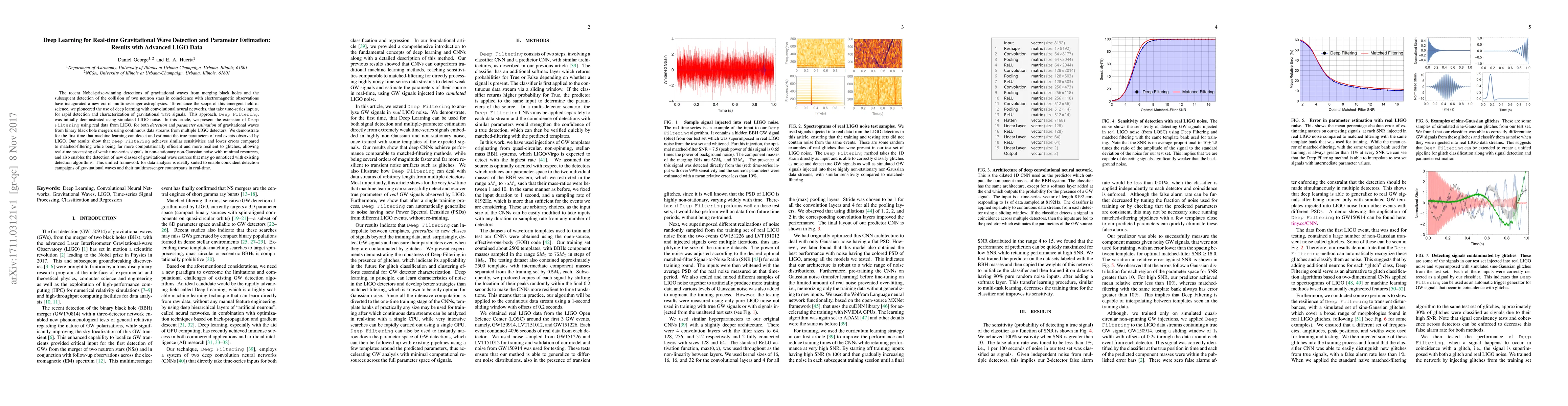 This paper demonstrates the application of deep learning, specifically convolutional neural networks, to detect and estimate parameters of gravitational waves from binary black hole mergers using real Advanced LIGO data. Deep Filtering, a machine learning approach, shows comparable sensitivity and lower errors than traditional methods, while being more efficient and resilient to noise, thus enabling real-time detection of gravitational waves.